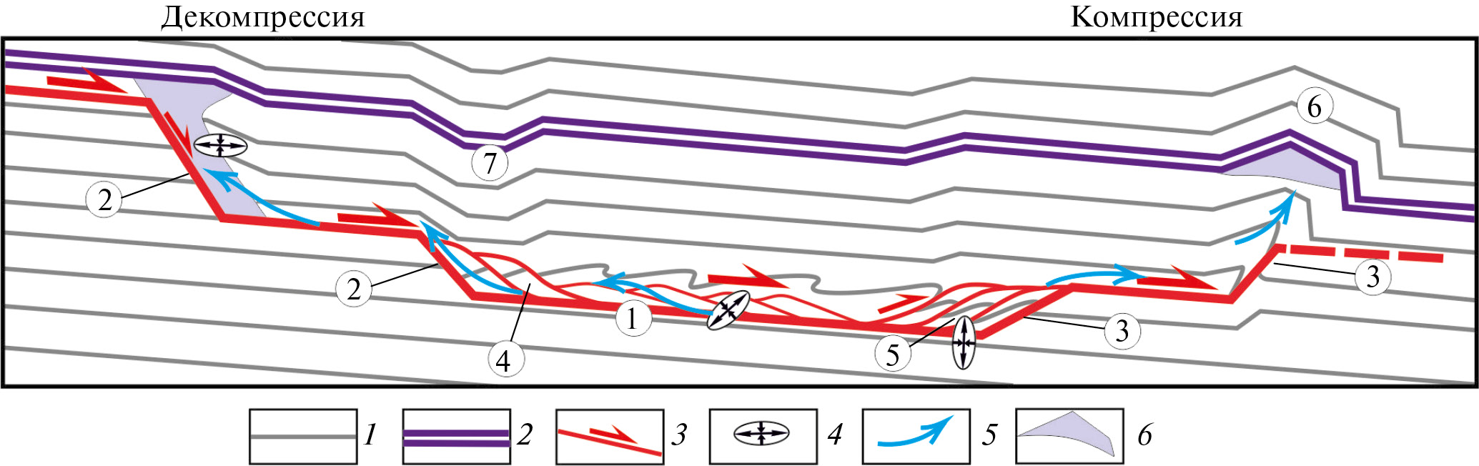 Развитие детачментов в северной части Адыгейского сегмента Большого Кавказа происходило в условиях взбросо-сбросового режима деформаций при наклонном положении осей сжатия и растяжения, расположенных приблизительно в одной плоскости с векторами перемещений. При этом оси сжатия ориентированы под большими углами (60°‒70°), а оси растяжения образуют малые углы (20°‒30°) с горизонтальной плоскостью (см. рис. 7, группа 2).