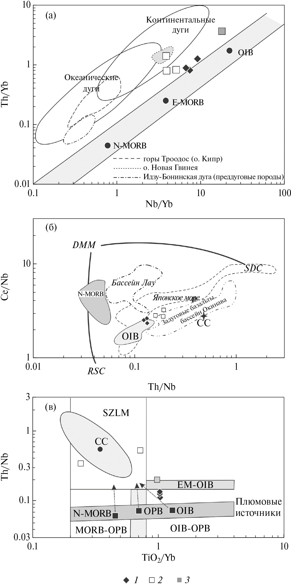 Положение исследованных составов на диаграммах в полях базальтов континентальных и задуговых обстановок, геохимические и изотопные особенности состава вулканитов позволяют предполагать, что формирование бассейна происходило на коре переходного типа (рис. 11, а, б).