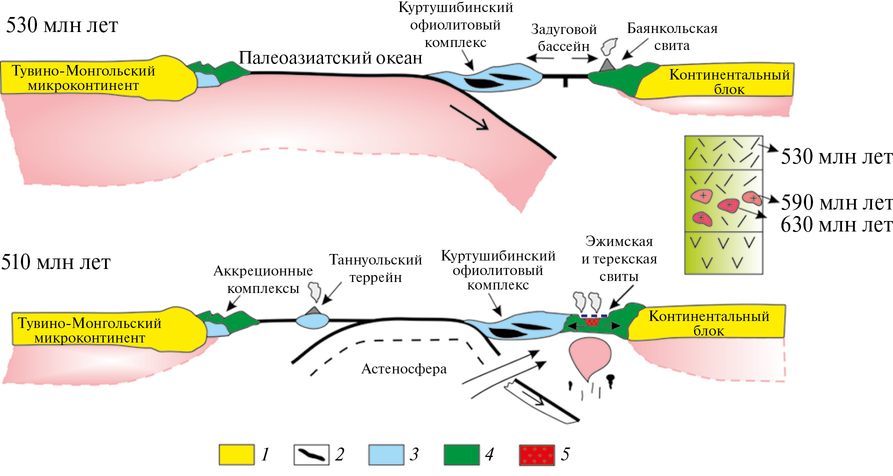 Почти синхронно с формированием толщ Систигхемского террейна в пределах Палеоазиатского океана в интервале 540‒520 млн лет происходило формирование вулканогенных и гранитоидных пород Таннуольского островодужного террейна, но субдукционные процессы в пределах этой зоны продолжались вплоть до конца раннего кембрия [3, 18, 22].