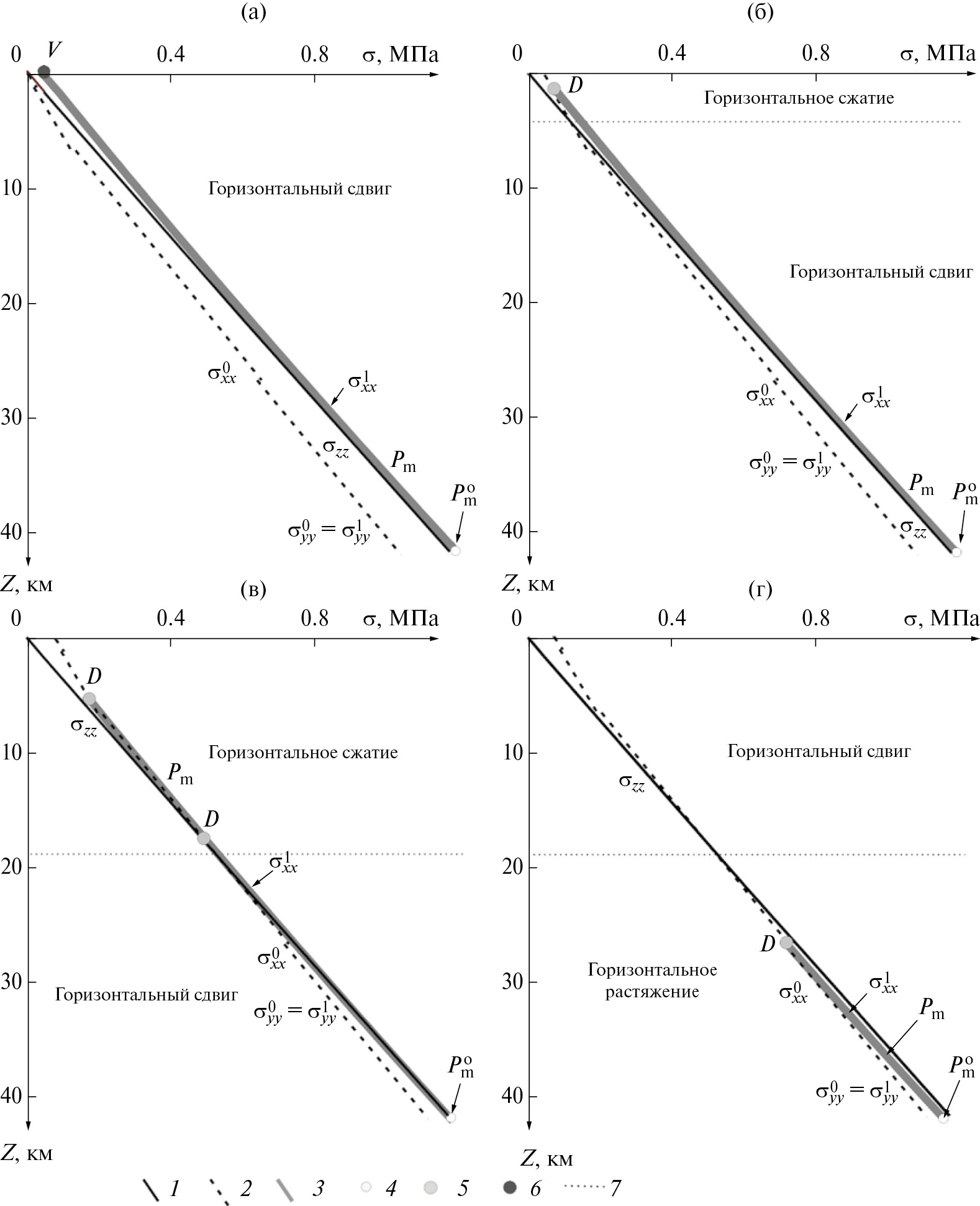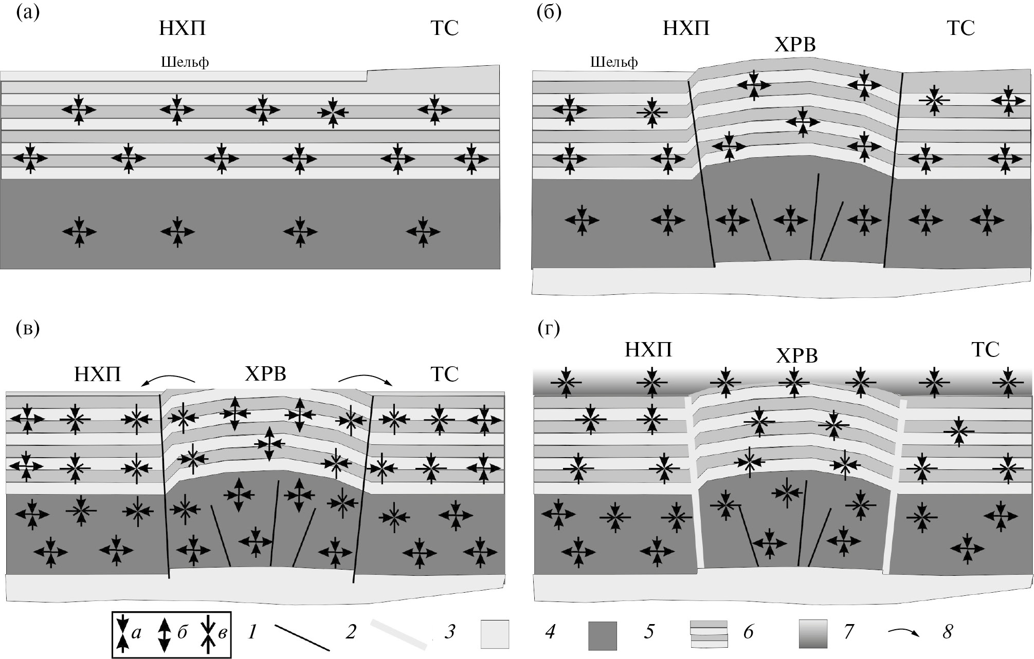 Рис. 2. Схемы напряженных состояний в вертикальном разрезе осадочного чехла и кристаллической коры Хантайско-Рыбнинского вала, а также прилегающих структур (а) в начале палеозоя; (б) к концу палеозоя (кембрий–начало пермского периода) без учета эрозии; (в) к концу палеозоя с учетом эрозионных процессов Хантайско-Рыбнинского вала; (г) в триасе, в период магматических излияний.
