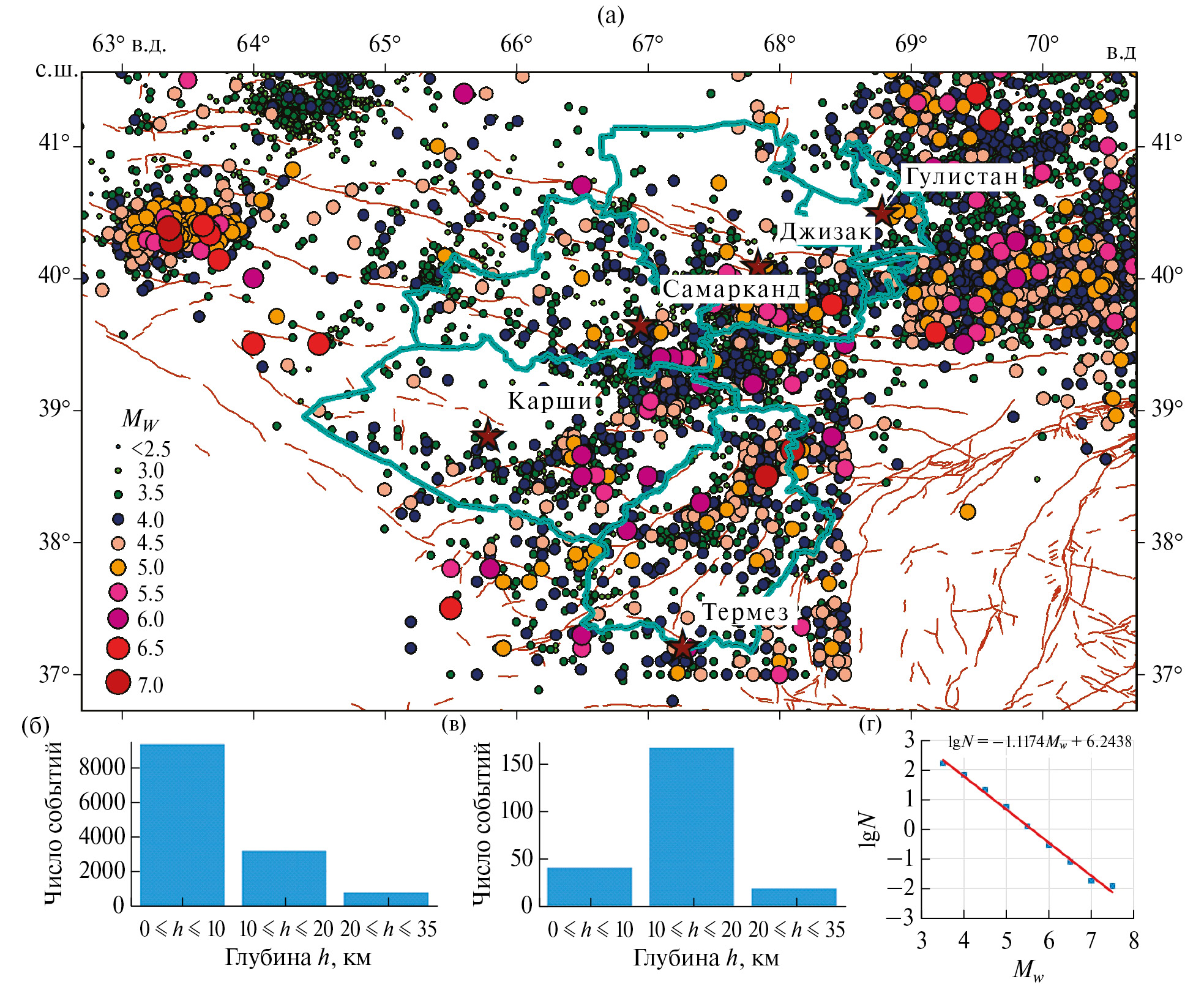 Показаны гистограммы распределения сейсмических событий различных магнитуд по глубинам и графики повторяемости землетрясений Регионального каталога [1, 64] (см. рис. 3, б-г). Рассчитанный нами угловой коэффициент графика повторяемости представительных землетрясений равен b=1.1174. Бо`льшая часть землетрясений с магнитудой Мw≥ 5.0 расположена в сейсмоактивном слое от 11 до 20 км (см. рис. 3 в).