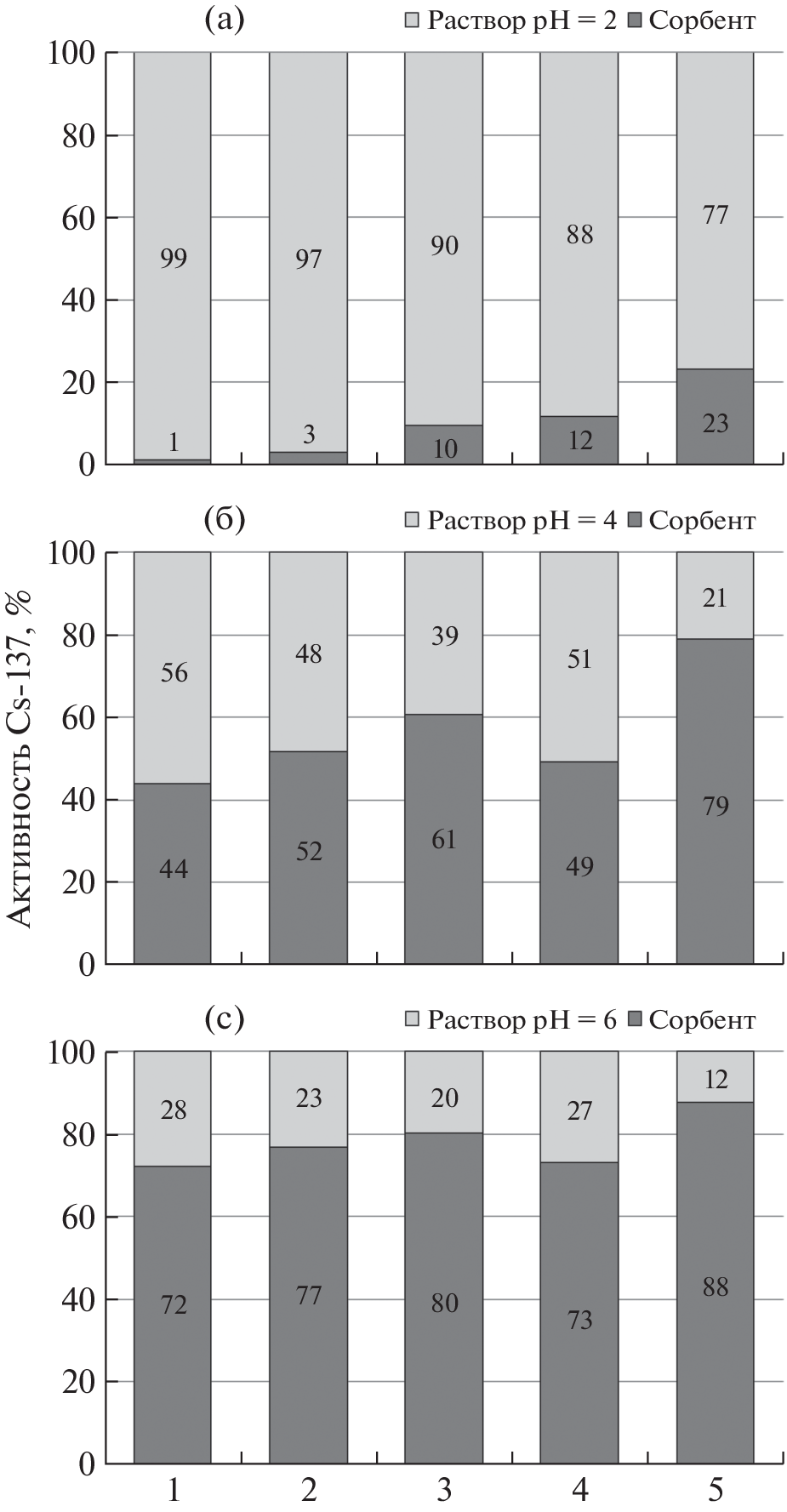 Проведено исследование сорбционных свойств верхового торфа и продуктов его последовательной разборки, а также дана оценка связывания Cs-137 исследуемыми материалами. По результатам низкотемпературной адсорбции азота удельная поверхность пор исследуемых материалов варьируется в диапазоне от 1.48 до 5.96 м2/г, суммарный объем пор от 0.002 до 0.009 см3/г. Величина предельной адсорбции Cs-137 для исследуемого верхового торфа варьируется в диапазоне от 1 до 51 Бк/г, что существенно превышает фоновые значения активности Cs-137, определяемые в торфяной залежи, и указывает на высокую сорбционную емкость верховых торфяников по отношению к техногенным радионуклидам. Для производных торфа, полученных методом последовательной разборки, величины предельной сорбции составляют от 2 до 61 Бк/г в области исследуемого диапазона рН. Выявлено, что рН среды и природа сорбента – ключевые факторы, определяющие эффективность сорбции Cs-137. Установлено, что значения предельной сорбции Cs-137 для торфа и продуктов на его основе увеличиваются с ростом рН.