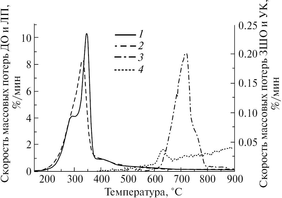 Рис. 1. ДТГ зависимости для исходных сырьевых материалов в потоке азота: ДО – 1, ЛП – 2, ЗШО – 3, УК – 4.