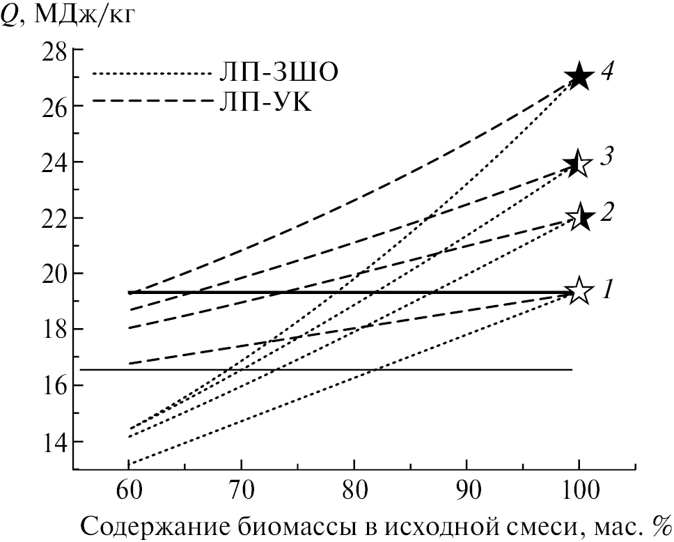 Рис. 3. Зависимость теплоты сгорания исходных (1) и торрефицированных при различных температурах (240°С – 2, 270°С – 3, 300°С – 4) пеллет из смесей ЛП-ЗШО и ЛП-УК от их состава перед торрефикацией.