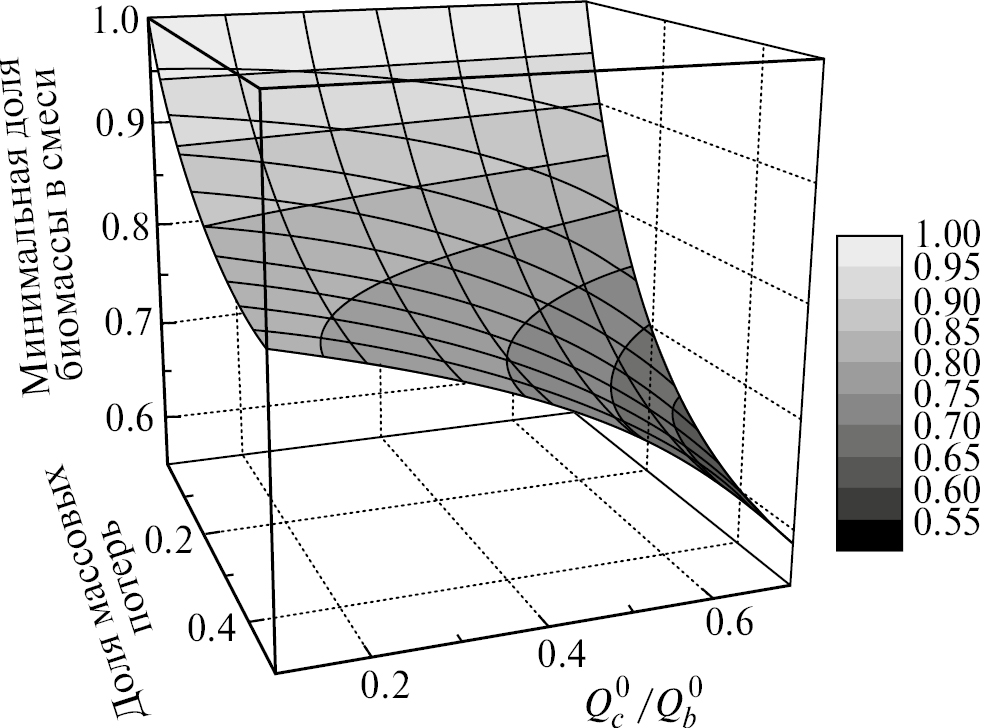 Учитывая уравнения (1), (2), минимальную долю биомассы в исходной смеси, удовлетворяющую предложенному критерию (3), можно представить в виде функции от величин массовых потерь и теплот сгорания углеродсодержащих отходов, исходной и торрефицированной биомассы: