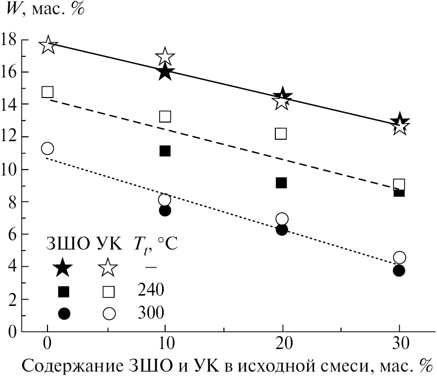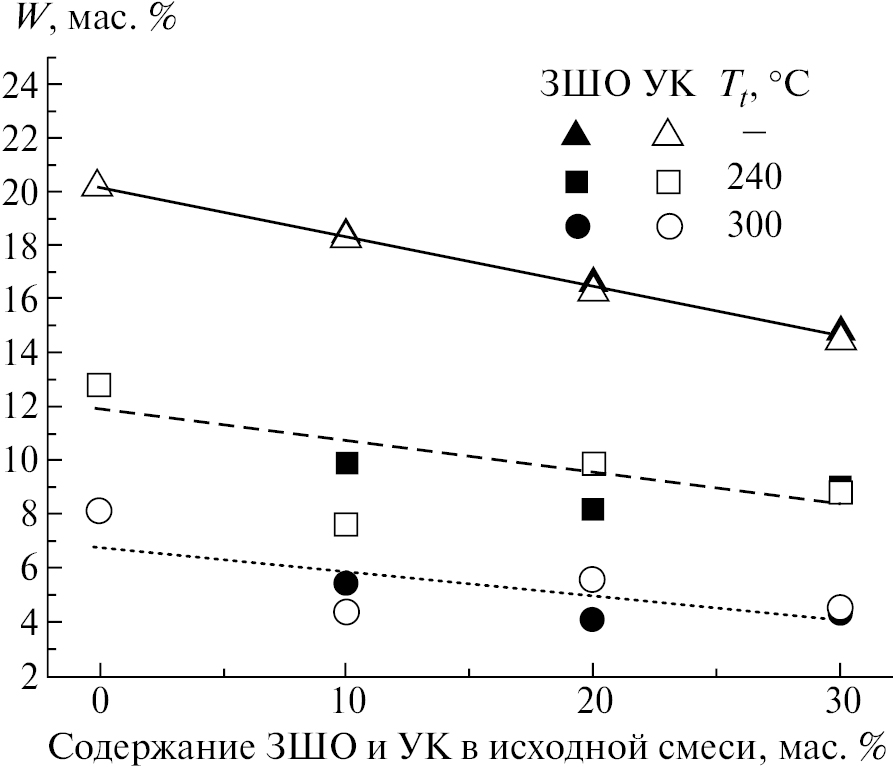 Как видно из табл. 2, ужесточение режимов торрефикации, выражающееся в увеличении температуры от 240°C до 300°C и приводящее к увеличению удельной теплоты сгорания торрефицированной биомассы, позволяет увеличить содержание ЗШО в смесях с ДО и ЛП на 7.8 и 8.5% соответственно, а содержание УК – на 12.3 и 13.1%.