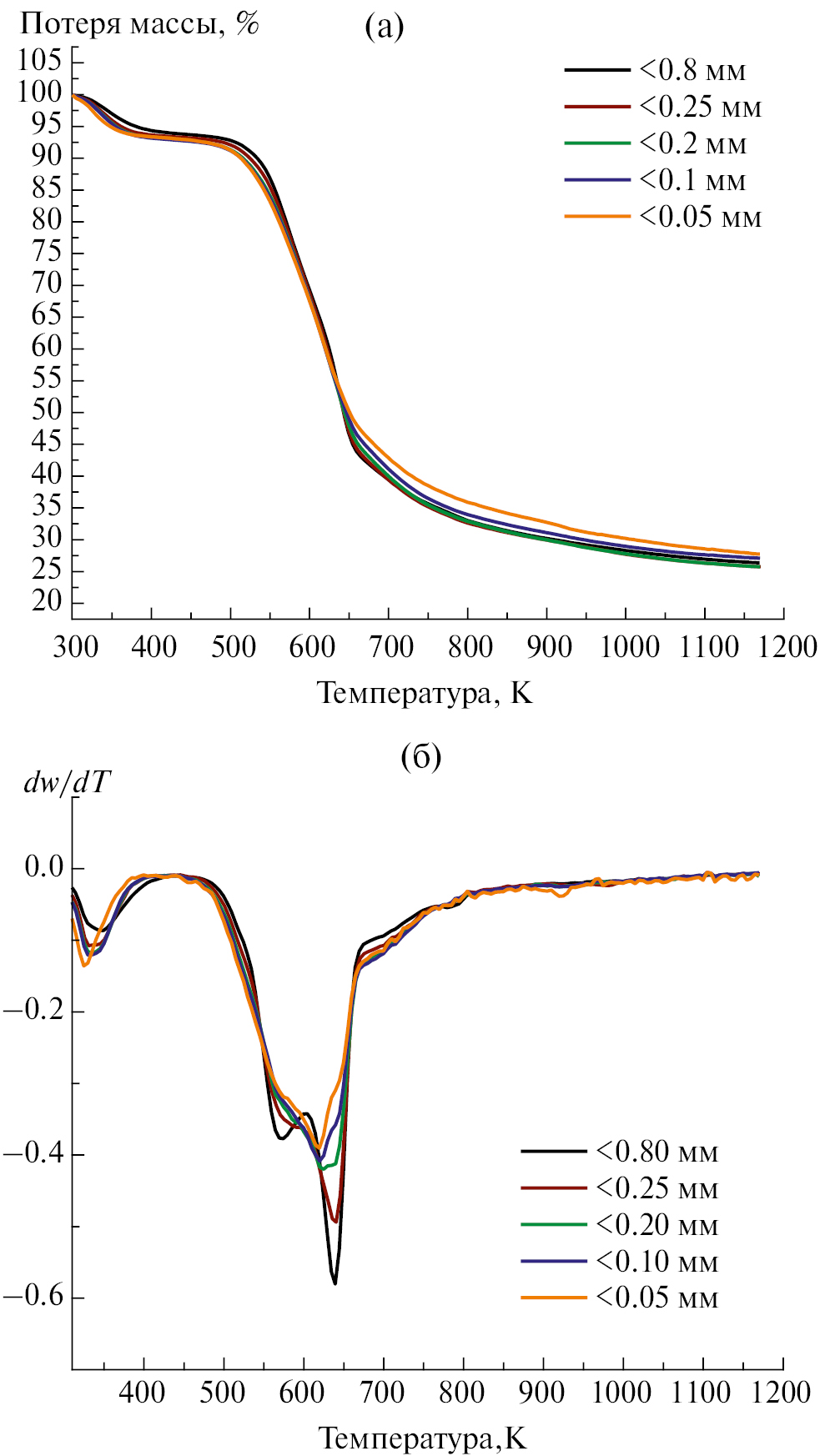 Термогравиметрические исследования пеллет из березового луба. Термогравиметрический анализ проводился с использованием образцов пеллет, полученных из пяти малых фракций (№ 1–5, табл. 1). На рис. 1 представлены результаты термогравиметрического исследования разложения луба. Из полученного графика можно сделать вывод о том, что термодеструкция образцов происходит примерно одинаково у всех образцов, независимо от фракционного состава. Ярко видно три выраженных этапа. Первый происходит до температуры 325 К – это удаление воды из образцов. Затем в интервале 500–560 К резкое уменьшение массы – деструкция органической части до легколетучих компонентов. А при дальнейшем повышении температуры идет процесс ароматизации лигнина, разложение термостабильных компонентов и окисление образовавшегося угля [14]. Более подробное описание процессов, происходящих при термическом разложении пеллет из чистого луба, приведено ниже (в следующем подразделе).