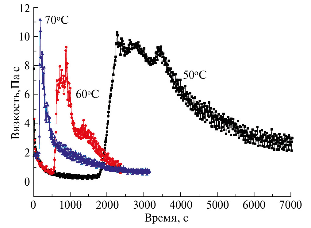 Рис. 1. Зависимости вязкости от времени, полученные в ротационном режиме при постоянной скорости сдвига (3 с–1) при 50, 60 и 70°С