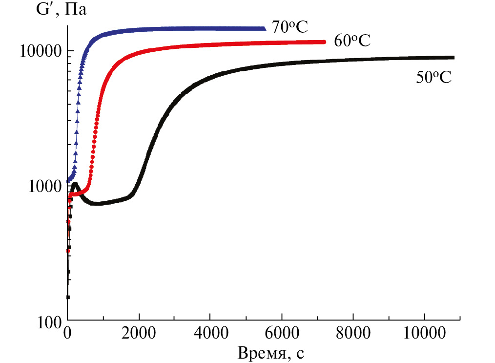На рис. 4 представлены зависимости, отражающие кинетику модуля упругости Gʹ для исследуемого ГОС при 50, 60, 70°С. С повышением температуры сокращается время образования геля, а также повышается прочность сформированной структуры (о чем свидетельствует увеличение максимального значения модуля Gʹ). Индукционный период, зарегистрированный для образца при 50°С, с 650 до 750 с по оси времени, практически полностью исчезает на зависимости, полученной для того же образца при 70°С. Промежуточный экстремум модуля упругости в представленном масштабе отчетливо виден на кривой, соответствующей 50°С, отсутствует на зависимостях, полученных для более высоких температур. Время начала гелеобразования, определенное по резкому росту модуля упругости, при 70°С составляет 200 с, при 60°С – 570 с, при 50°С – 1920 с, эти значения близки к определенным ранее из анализа кривых рис. 1. С учетом погрешности графического метода определенные значения совпадают с независимо полученными результатам определения точки потери текучести визуальным методом по подвижности образца в пробирке. С повышением температуры максимальное значение модуля упругости сформировавшегося геля возрастает, и составляет 8750 Па для 50°С, 11 600 Па – для 60°С, и 14 700 Па – для 70°С. Увеличение Gʹ с ростом температуры может быть связано с упрочнением термотропной составляющей геля.