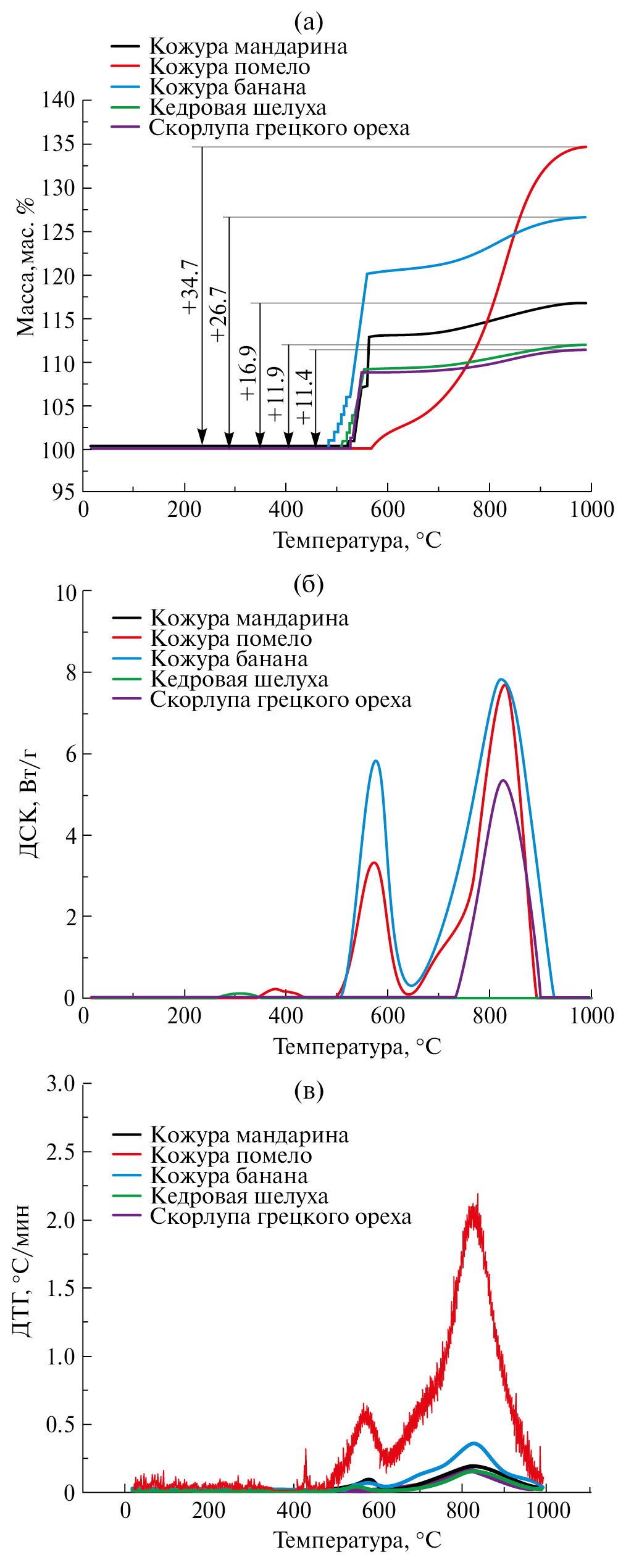 Из анализа рис. 2, а можно сделать следующие выводы: температура начала окисления карбида титана, полученного с применением углерода из кожуры банана составила ~484°С, полученного из углерода скорлупы кедровых орехов ~51°С, из мандариновой цедры ~521°С, из скорлупы грецкого ореха ~526°С, из цедры помело ~564°С. Процесс окисления карбидов титана (рис. 2, б) происходит с существенным выделением энергии в интервале набора массы, пик максимального выделения энергии практически у всех образцов находится в диапазоне температур 820–830°С, для карбида титана с применением углерода из цедры помело и кожуры банана наблюдается максимальный пик выделения энергии – 7.7 и 7.6 Вт/г соответственно. Стоит отметить, что процесс окисления карбида титана, синтезированного безвакуумным электродуговым методом, протекает с существенным выделением энергии в диапазоне достаточно высоких температур. Данные ДСК рис. 2, в) позволяют установить, что максимальная скорость окисления, синтезированного на основе углерода, полученного из биомассы, протекала в интервале температур ~600–800°С. Изменение (увеличение) массы образцов свидетельствует об увеличении ее в широком диапазоне масс от – 11.4 до 34.7%, в зависимости от изменений вида углеродной составляющей.