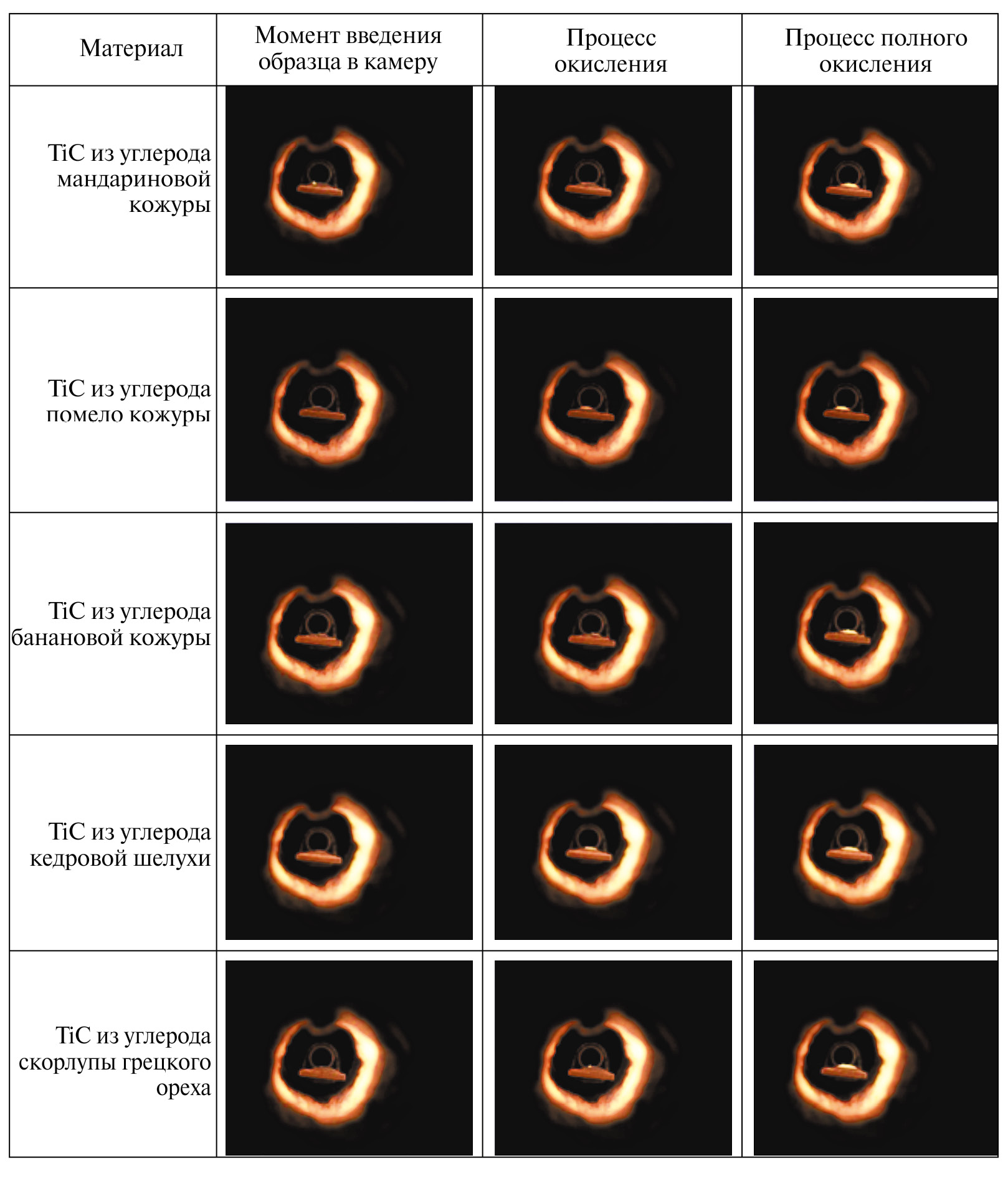 Рис. 4. Типичные изображения высокоскоростной видеосъемки процесса окисления и горения исследуемых образцов карбидов титана.