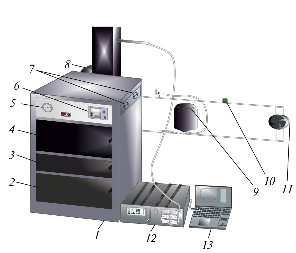 Рис. 1. Принципиальная схема экспериментального стенда исследования слоевого процесса сжигания твердых топлив: 1 – котельный агрегат со слоевым способом сжигания, 2 – дверца зольной камеры, 3 – дверца чистки камеры горения, 4 – загрузочная дверца, 5 – капиллярный термометр, 6 – частотный регулятор, 7 – регуляторы первичного и вторичного воздуха, 8 – дымосос, 9 – расширительный бак, 10 – насос для циркуляции теплоносителя, 11 – потребитель тепла (тепловой вентилятор), 12 – поточный газоанализатор продуктов сгорания, 13 – персональный компьютер для сбора и обработки данных поточного газоанализатора.