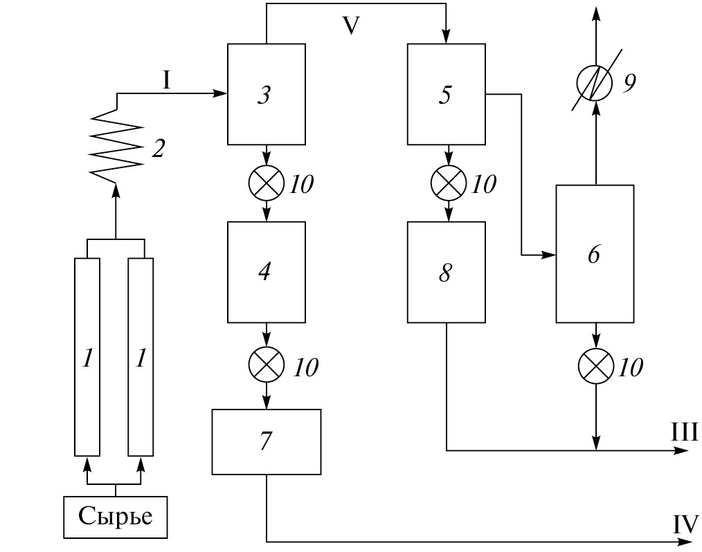 Рис. 1. Принципиальная схема пилотной установки термолиза тяжелых нефтяных остатков: 1 – дозатор, 2 – печь, 3 – реактор, 4, 5 – холодный сепаратор высокого давления, 6 – холодный сепаратор низкого давления, 7, 8 – приемники, 9 – газовые часы, 10 – холодильник, 11 – вентиль. Технологические потоки: I – суспензия, II – газ, III – дистиллят, IV – жидкие продукты, V – парогазовый поток.