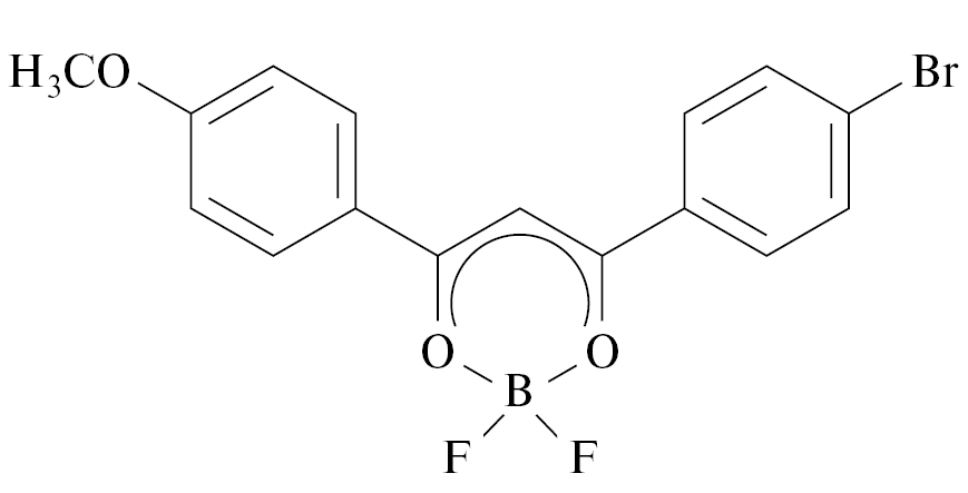 2,2-Дифтор-4-(4′-бромфенил)-6-(4′-метоксифенил)-1,3,2-диоксаборин (DBD). Порошок желтого цвета, т. пл. 217—219°С. Спектр ЯМР 1Н (aцетон-d6, δ, м.д., J/Гц): 3.96 (с, 3 Н, СН3О); 7.12 (д, 2 Н, C6H4Br, J = 12.0); 7.69 (с, 1 Н, γ-СН); 7.81 (д, 2 Н, C6H4OMe, J = 8.6); 8.31 (д, 2 Н, C6H4Br, J = 8.6); 8.35 (д, 2 Н, C6H4OMe, J = 9.4). Спектр ЯМР 13C (aцетон-d6, δ, м.д.): 57.28, 94.92, 116.61, 131.09, 132.08, 133.85, 134.14, 134.95, 136.34,168.12, 206.85. ИК-спектр (KBr), ν/см–1: 1605, 1589 (BrC6H4, CH3OC6H4); 1555, 1523 (C=O, C=C); 1273 1253 (B—F); 1128, 1094 (B—O). Масс-спектр (ESI+), m/z (Iотн (%)): 417 [M + 2H2O]+ (100), 366 [M–F]+(40). Найдено (%): С, 50.27; Н, 3.41. C16H12BrBF2O3. Вычислено (%): С, 50.89; H, 3.15.