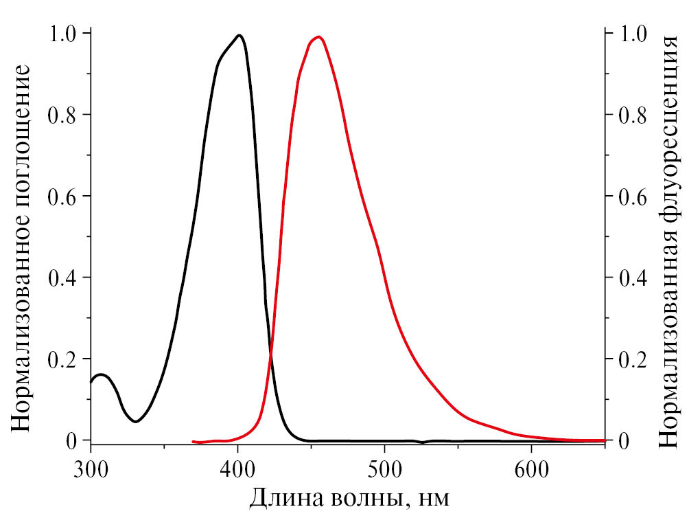 Спектры поглощения и флуоресценции в ацетонитриле (рис. 2) соединения DBD характеризуются максимумом поглощения 410 и 456 нм соответственно. Квантовый выход флуоресценции DBD в ацетонитриле составил 0.80, что указывает на выраженные люминесцентные характеристики данного красителя.