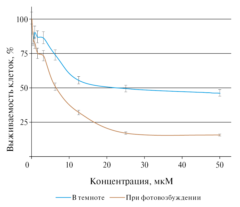 Клетки рассевали в лунки 96-луночного планшета (NUNC, США) (5000 клеток в 190 мкл культуральной среды), инкубировали 24 ч при 37оС, 5% СО2, в увлажненной атмосфере. Вносили по 10 мкл раствора исследуемых веществ в культуральной среде, приготовленных серийными разведениями из исходных растворов, до конечных концентраций 1.6–50 мкмоль/л (конечная концентрация растворителя не превысила 0.5 об. %). Контролем служили клетки без препарата (интактный контроль). В темновом эксперименте клетки инкубировали 48 ч при 37оС, 5% СО2, в увлажненной атмосфере и за 1 ч до окончания инкубации в лунки вносили по 20 мкл водного раствора МТТ (5 мг/мл, ПанЭко, Россия). В световом эксперименте клетки инкубировали 24 ч при 37оС, 5% СО2 с теми же концентрациями соединения, заменяли клеточную среду, после чего фотовозбуждали накопленное клетками соединение диодным источником света 400 нм (конечная плотность дозы 30 Дж/см2), инкубировали 24 ч в темноте для развития гибели и в лунки вносили по 20 мкл водного раствора МТТ (5 мг/мл, ПанЭко, Россия). После окончания инкубации клеток с МТТ-реагентом культуральную среду отбирали, клетки ресуспендировали в 100 мкл ДМСО и измеряли оптическую плотность раствора на планшетном спектрофотометре Мultiscan FC (Thermo Scientific, США) при длине волны 571 нм. Процент клеток, выживших при действии каждой концентрации исследуемых веществ, подсчитывали как частное от деления средней оптической плотности в лунках после инкубации с данной дозой к средней оптической плотности контрольных лунок (значения последних приняты за 100%). Каждую концентрацию изучали c 3-х кратной статистикой по результатам трех независимых экспериментов.