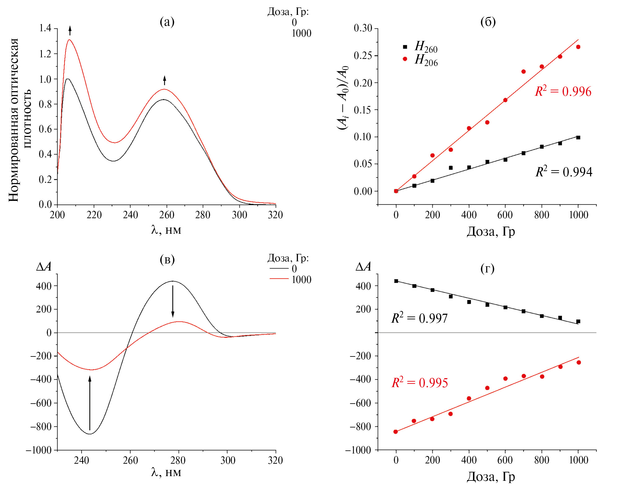 На рис. 1а показаны изменения спектра поглощения водно-солевого раствора ДНК, вызванные воздействием на него рентгеновского излучения в дозе 1000 Гр. Видно, что в исследуемых условиях облучение приводит к увеличению оптической плотности (до ≈10% в области 260 нм и до ≈27% в области 206 нм) – так называемому радиационно-индуцированному гиперхромизму. Зависимости величины гиперхромного эффекта Hλ на длинах волн 260 и 206 нм от дозы, рассчитанные по формуле (1):