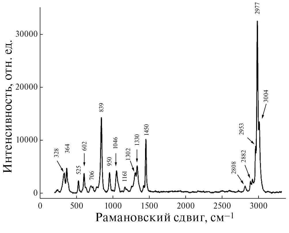 В спектре рамановского рассеяния ЭТФЭ присутствуют три интенсивные полосы при 839, 1450 и 2977 см–1, соответствующие симметричным и асимметричным валентным колебаниям CF2 и CH2 (рис. 2). Полосы в области волновых чисел 200–1000 см–1 также связаны с колебаниями С–Н и C–F связей [10, 11].