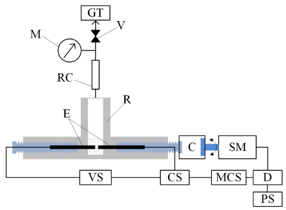 Рис. 1. Схема экспериментальной установки: R — реактор; RC— обратный холодильник; E — электроды; M — манометр; V — клапан; GT — газовая ловушка; C — муфта; SM — шаговый двигатель; D — драйвер шагового двигателя; PS — блок питания шагового двигателя; CS — датчик тока; MCS — микропроцессорная система управления; VS — источник напряжения.