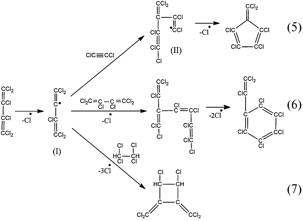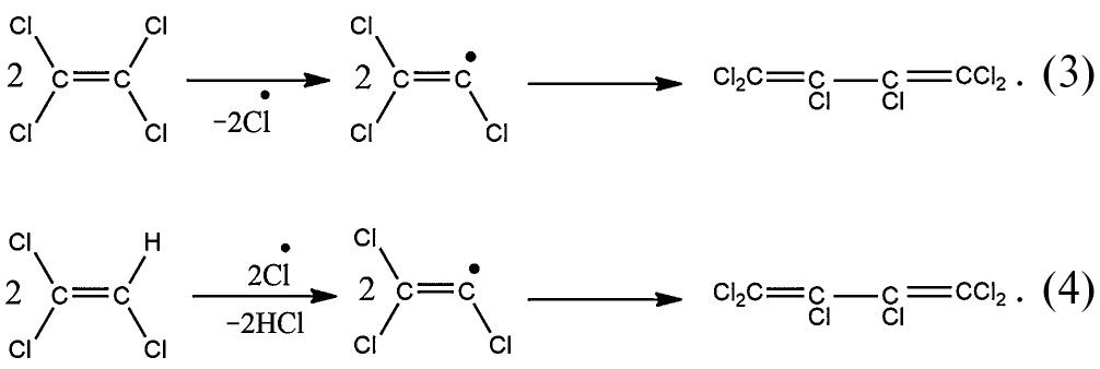 Образование гексахлорбутадиена из трихлорэтилена может протекать как через разрыв связи C–H с дальнейшей димеризацией образующихся радикалов (реакция (4)), так и через промежуточное образование в качестве активного прекурсора дихлорацетилена [29].