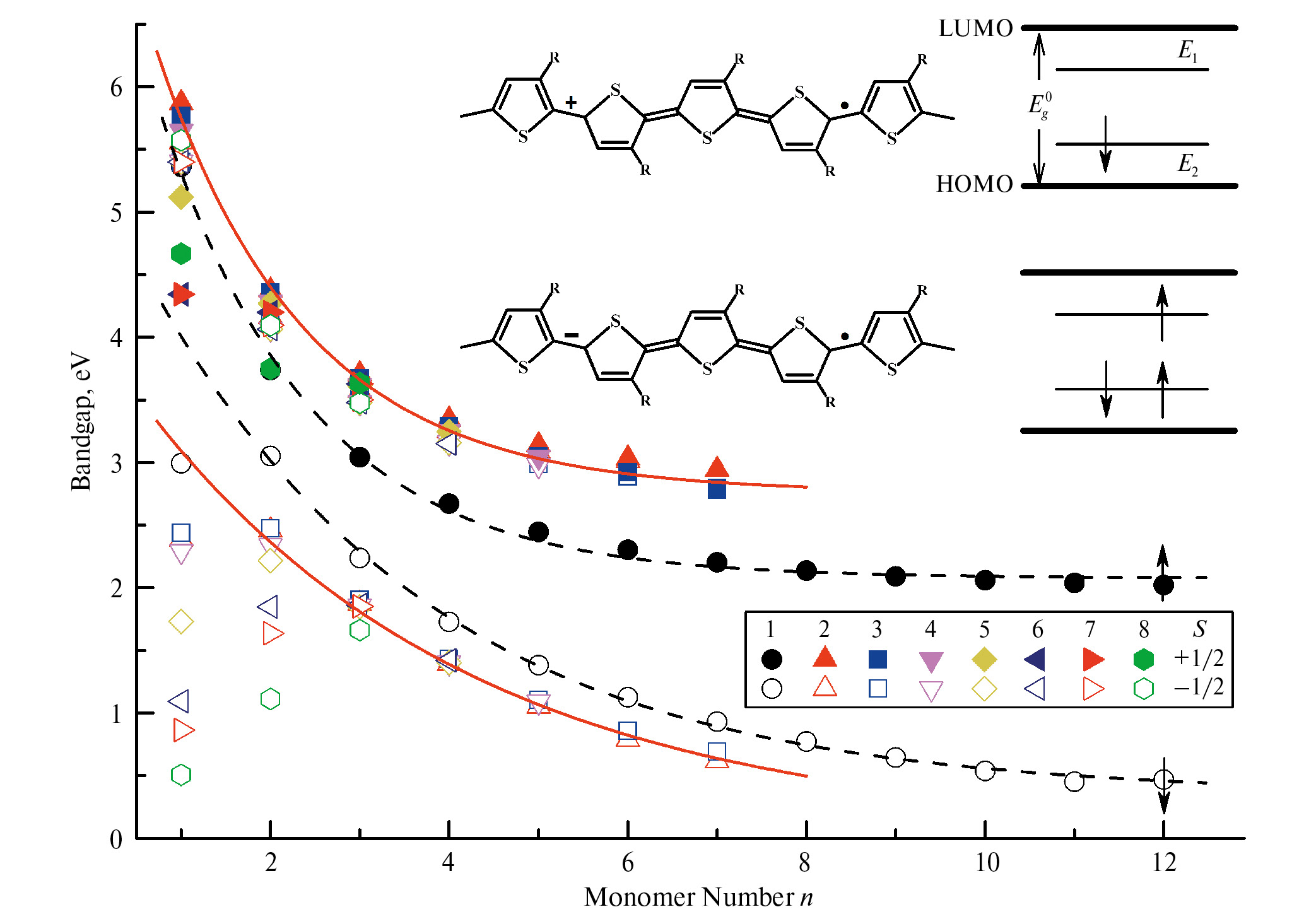 Рис. 2. Зависимость ширины запрещенной зоны Eg = EHOMO – ELUMO олигомеров P3HyT (1), P3MeT (2), P3EtT (3), P3BuT (4), P3HxT (5), P3OcT (6), P3DeT (7) и P3DoT (8) с разным числом мономеров n и длиной алкильных заместителей m, оптимизированных в рамках формализма/теории функционала плотности (DFT), в приближении Малликена/Mulliken в среде пакета Orca согласно процедуре, описанной в Методическом разделе. В верхней части приведены схематические структуры положительно и отрицательно заряженных поляронов на цепях P3AT с их соответствующими энергетическими подуровнями в запрещенной зоне олигомера. Линиями показаны зависимости, рассчитанные из уравнения (1) при (сверху вниз) a0 = 2.761 эВ, b = 5.447 эВ, c = 1.669, a0 = 2.078 эВ, b = 5.886 эВ, c = 1.671, a0 = 0.347 эВ, b = 5.029 эВ, c = 3.153, и a0 = 0.050 эВ, b = 4.003 эВ, c = 3.650 соответственно