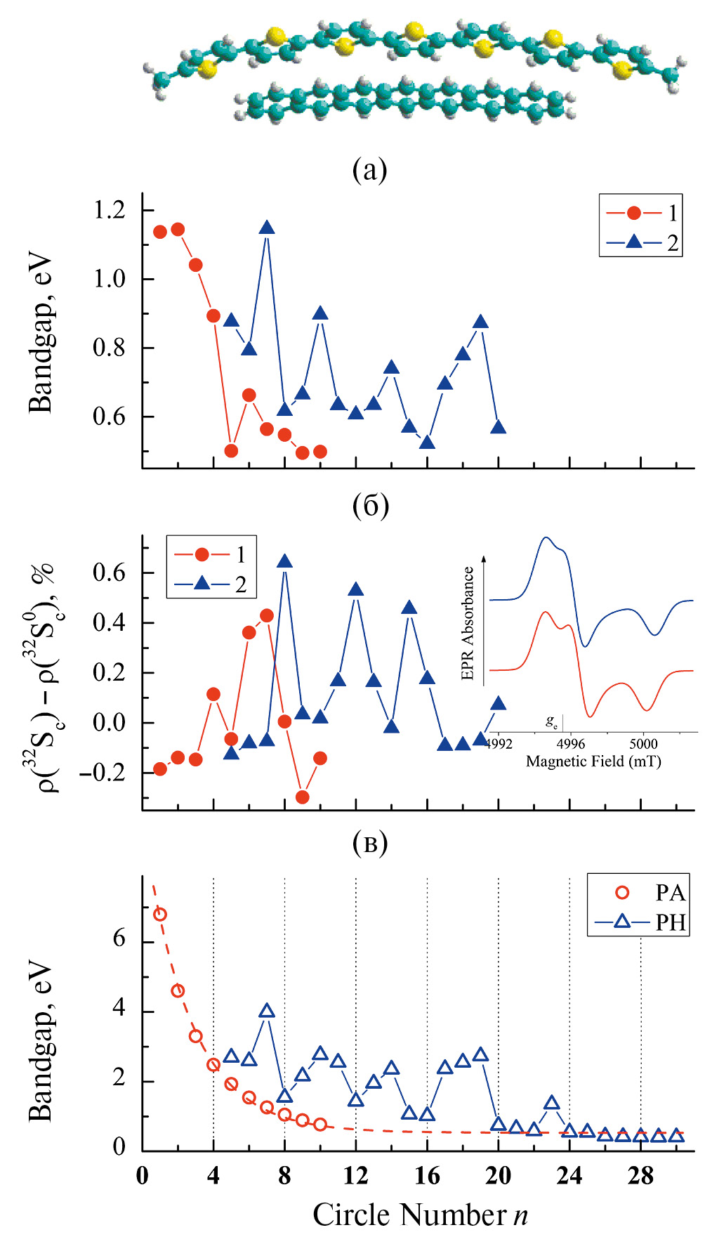 Рис. 5. (a) Изменение ширины запрещенной зоны комплекса олиго7мера P3HyT:PA (1) и P3HyT:PH (2) в зависимости от числа фенильных колец n; (б) спиновая плотность на ядрах серы 32S в пределах протяженного полярона композитов P3HyT:PA (1) и P3HyT:PH (2) как функция n. На вкладке верхней и нижней линиями показаны спектры ЭПР D-диапазона комплексов P3HyT:PA1 и P3MeT:PA1 соответственно, рассчитанные с использованием данных табл. 4; (в) ширина запрещенной зоны ароматических Q1D РА и Q2D РН молекул в зависимости от числа их фенильных колец n. Пунктирной линией показана зависимость, рассчитанная из уравнения (1) с a0 = 0.532 эВ, b = 8.968 эВ и c = 2.647. В верхней части в качестве примера изображен структурно-оптимизированный комплекс P3HyT:PA7