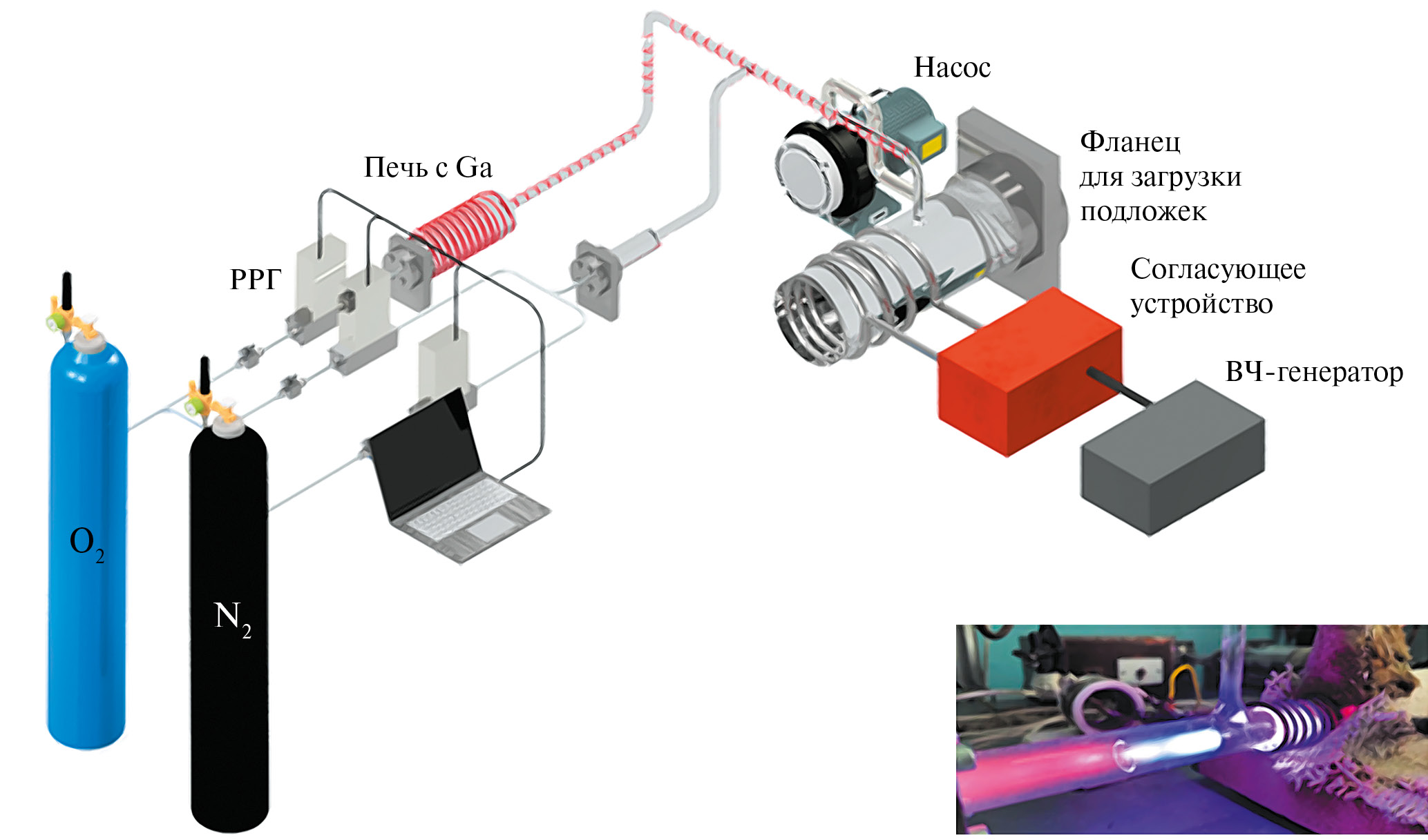 Схематическое изображение установки синтеза тонких пленок системы β-Ga2O3−GaN приведено на рис. 1. Детальное описание установки также приводится нами в работах [21, 22].