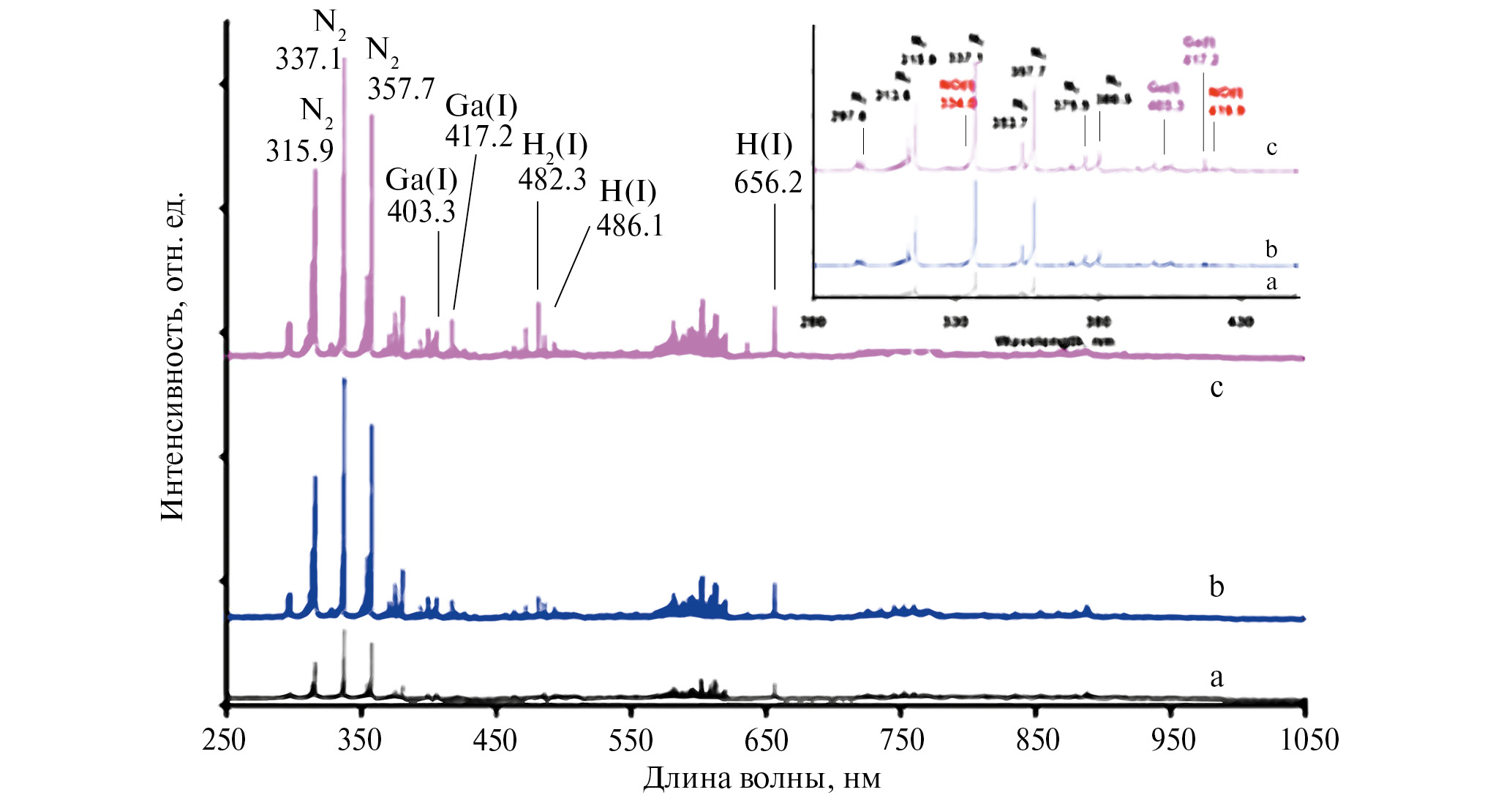 Рис. 2. Эмиссионный спектр плазмы смеси Ga-H2-O2-N2 при различном содержании азота: a – 1%; b – 3%; c – 7%. Во вставке представлен участок спектра в диапазоне 280–1100 нм