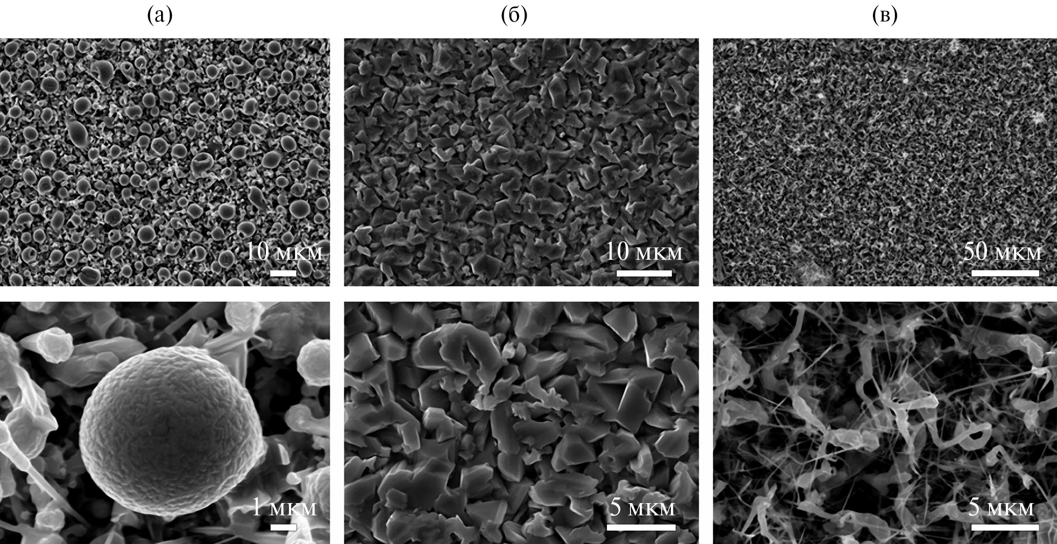 Морфология поверхности образцов была изучена методом сканирующей электронной микроскопии (СЭМ). Полученные СЭМ-изображения приведены на рис. 3. Можно отметить, что размер и форма структурных фрагментов существенно различны. Поверхность образца с минимальным содержанием GaN 2% (рис. 3a) образована мелкими кристаллами с размерами от нескольких сотен нанометров до 1 мкм и сферическими частицами с размерами в несколько микрон. Увеличение содержания нитрида галлия до 5% (рис. 3б) приводит к существенному изменению морфологии поверхности, структура которой сформирована главным образом из поликристаллических “чешуек” со средним размером 1−3 мкм. Дальнейшее увеличение содержания нитрида галлия до 7% (рис. 3c) приводит к образованию нитевидных нанокристаллических структур толщиной несколько десятков нанометров в окружении поликристаллических фрагментов с размерами от одного до нескольких микрон.
