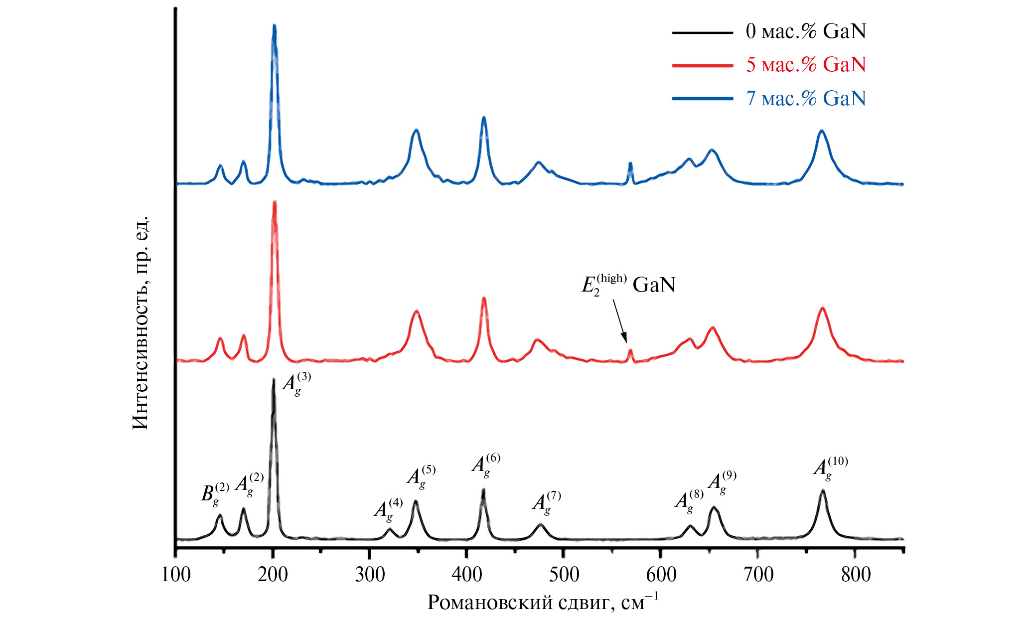 Спектры комбинационного рассеяния света пленок β-Ga2O3, легированных нитридом галлия, показаны на рис. 5. Комбинационно-активные моды у β-Ga2O3 следующие: моды растяжения и изгиба тетраэдра GaO4 на высоких частотах (770–500 см-1), моды деформации октаэдра GaO6 на средних частотах (480−310 см-1) и колебательные и трансляционные моды цепочек тетраэдров и октаэдров на низких частотах (200 см-1 и менее) [26].