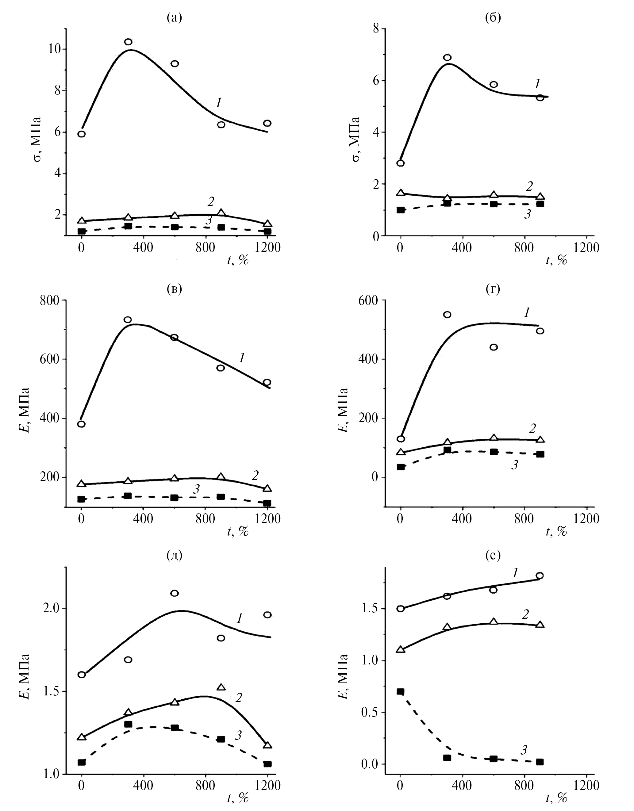 Рис. 2. Зависимости предела прочности при растяжении (а, б), деформации (в, г) и модуля упругости (д, е) ПКМ, наполненного терморасширенным графитом (а–в) или хлоридом калия (г–е) от времени СВЧ-обработки. Исследование деформационно-прочностных характеристик проводилось при температуре (К): 223 (1), 298 (2), 323 (3).