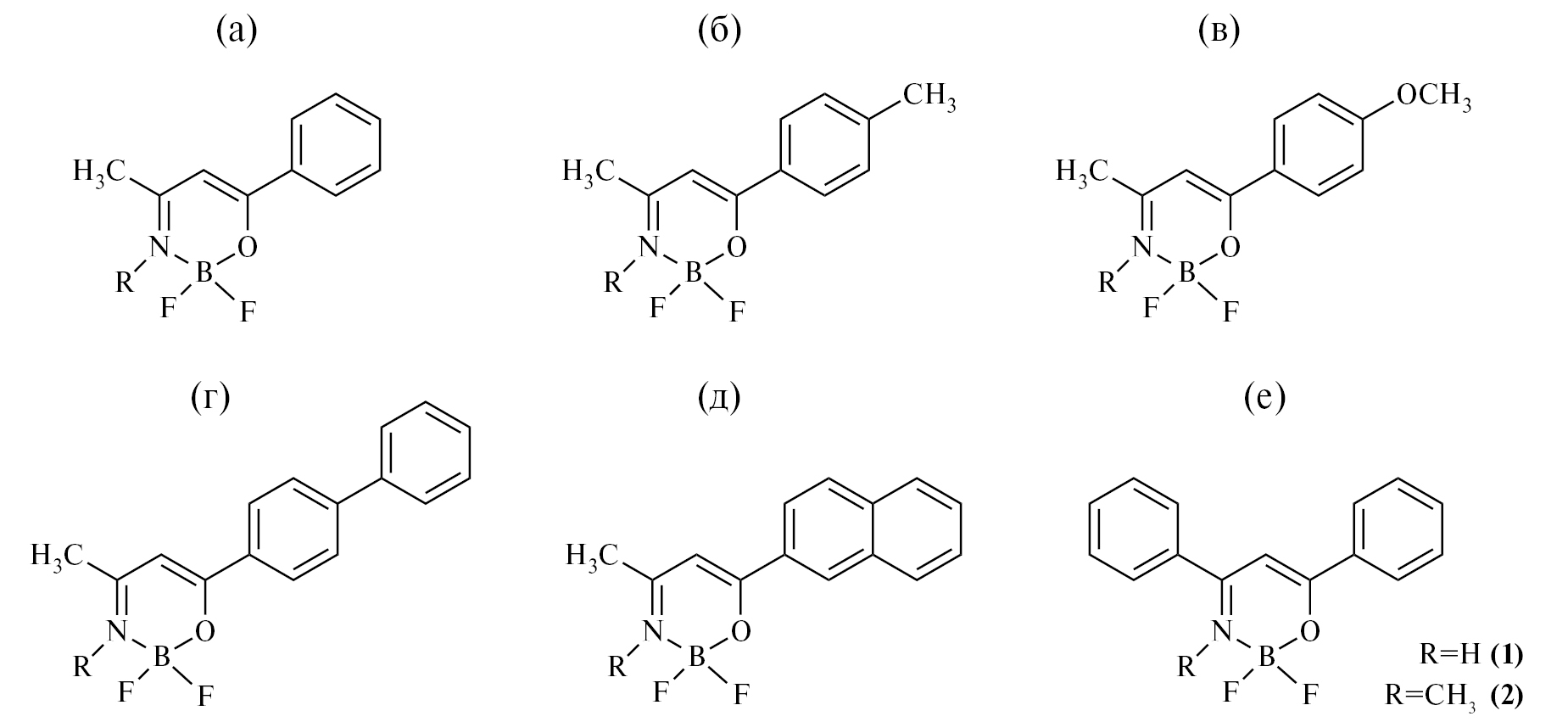 В качестве красителей в полимерных люминесцентных материалах применяют различные органические люминофоры, например β-дикетонаты дифторида бора [12, 13], спектральные свойства которых изучены достаточно широко [14]. β-кетоиминаты дифторида бора являются структурными и электронными аналогами β-дикетонатов дифторида бора. Благодаря большому коэффициенту молярной экстинкции и высокому квантовому выходу люминесценции в кристаллическом состоянии [15], а также способности к агрегационно- и кристаллизационно-индуцированной эмиссии и механохромизму β-кетоиминаты дифторида бора представляют собой перспективный класс люминофоров [8–10]. В отличие от полимерных композиций с β-дикетонатами дифторида бора, свойства полимерных материалов на основе β-кетоиминатов дифторида бора на сегодняшний день изучены недостаточно: известны лишь несколько работ, посвященных полимерам, функционализированным β-кетоиминатами дифторида бора [18–20]. В связи с этим интерес представляет исследование спектральных свойств полимерных композиций, допированных β-кетоиминатами дифторида бора.