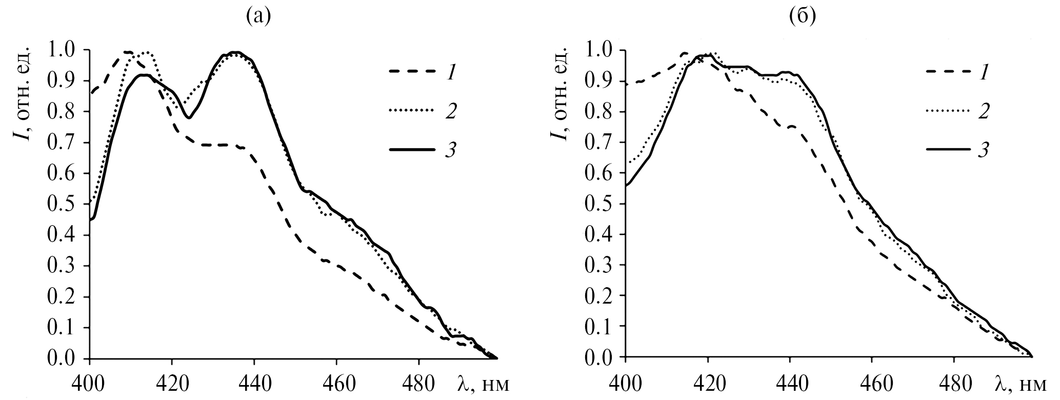 Рис. 1. Время-разрешенные спектры люминесценции 1a в ПС (а), зарегистрированные через 75.5 (1), 76 (2), 77.1 нс (3), и 2a в ПС (а), зарегистрированные через 75.5 (1), 75.6 (2), 75.7 нс (3), с момента импульса лазера.