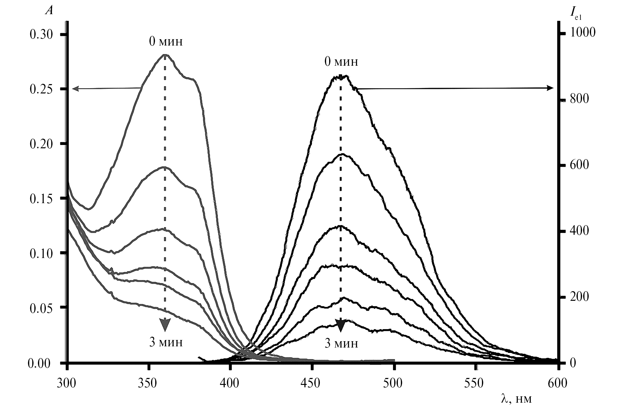 Спектроскопическое поведение и влияние растворителя на структуру соединения 1 было изучено достаточно подробно [8, 9], однако исследований относительно светочувствительности соединения не проводилось. Поэтому был исследован фотолиз соединения 1 в растворе ДМСО при облучении светодиодом (λ = 395 нм) в присутствии воздуха. При облучении раствора 1 в ДМСО в спектре поглощения происходит фотодеградация широкой длинноволновой полосы с максимумом при 365 нм, связанной с π-π*-переходом, совмещенным с процессом внутримолекулярного переноса заряда [10], а в спектре эмиссии наблюдается тушение фотолюминесценции (рис. 2). Следует отметить, что при проведении аналогичного эксперимента при облучении галоген-вольфрамовой лампой накаливания КГМ-24-150 заметных изменений в электронных спектрах поглощения и эмиссии не происходит.