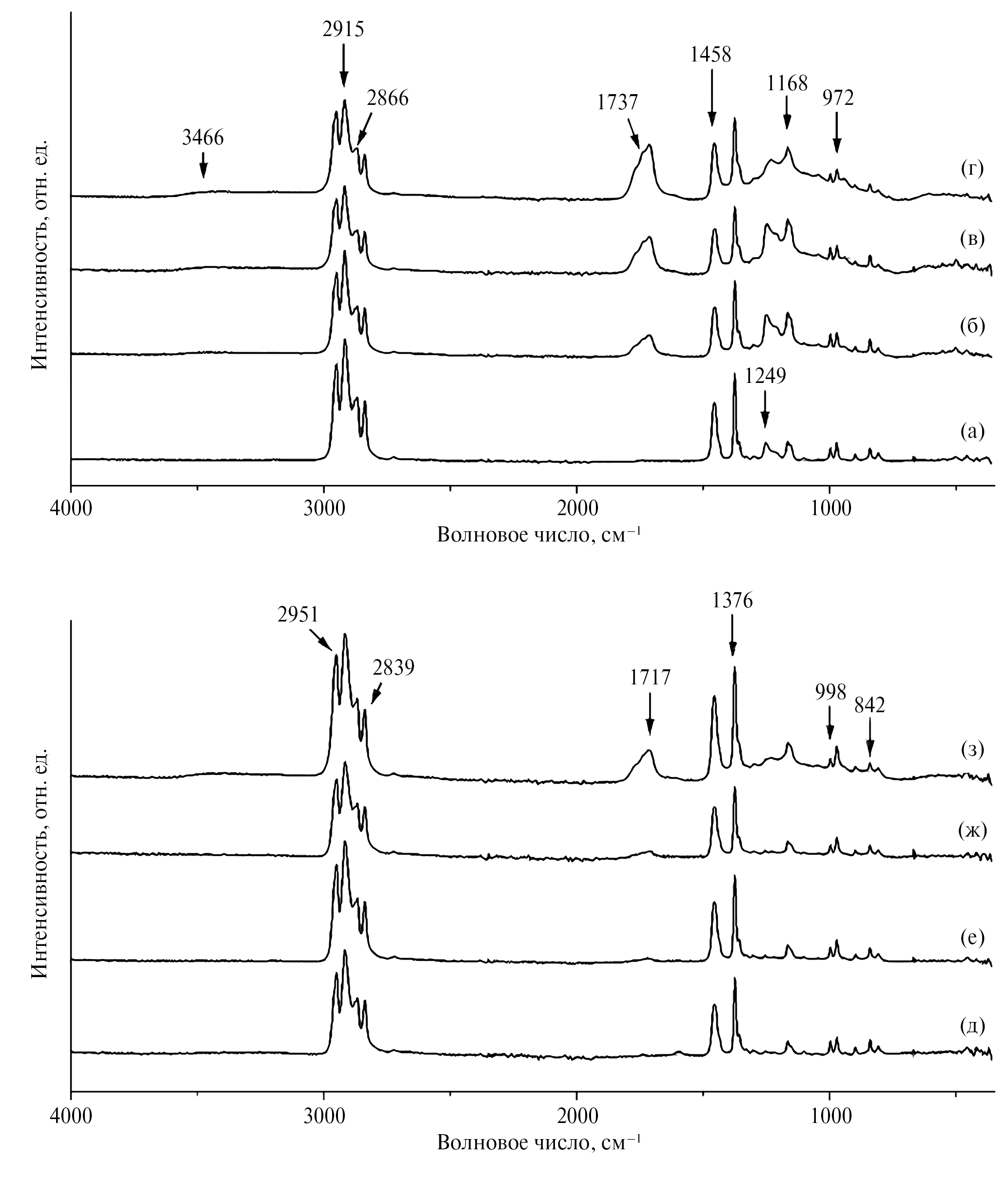Общий вид ИК-спектров облученных на воздухе различной дозой гранул ПП (а–г) и порошков (д–з), полученных при измельчении соответствующих гранул, представлены на рис. 1 со смещением вдоль оси ординат для удобства сравнения.