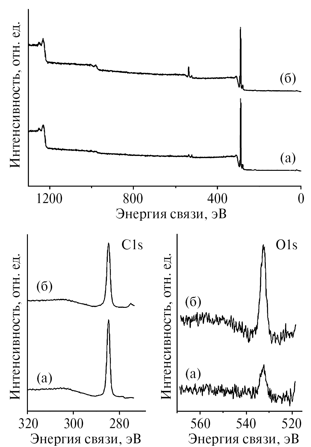 О радиационном окислении поверхности облученных гранул свидетельствуют данные исследования поверхности γ-облученных гранул методом РФЭ-спектроскопии. На рис. 2 представлен обзорный РФЭ-спектр необлученного ПП. На нем помимо углеродного (С1s) пика появляются также пик кислорода (O1s). Регистрируемый пик C1s соответствует связам C–C (284.7 эВ). Регистрируемая O1s линия с Есв = 532.3 эВ в спектре (рис. 2) обладает значением Есв молекулярно-хемосорбированного кислорода (532.2 эВ).