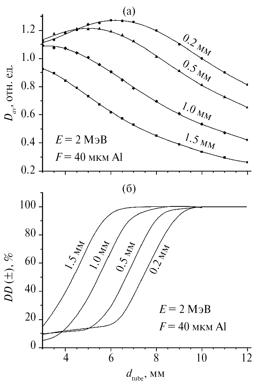 На рис. 3–5 показаны средние дозы Dav и отклонения дозы DD в зависимости от внутреннего диаметра пробирки dtube при некоторых толщинах стенки tw. Кривые на рис. 3а–5а существенно отличаются от зависимостей, известных как кривые “глубина–доза”, которые показывают изменение локальной дозы вдоль направления пучка электронов в материале с толщиной больше Rmax. Кривые на рис. 3а–5а показывают дозу (Dav), усредненную по всему объему воды в конкретной пробирке с фиксированным внутренним диаметром dtube, который может быть меньше Rmax. Таким образом, на рисунках представлен интеграл экспериментальной кривой “глубина–доза”, измеренной между точкой А и задней стенкой трубки (интеграл по длине dtube).