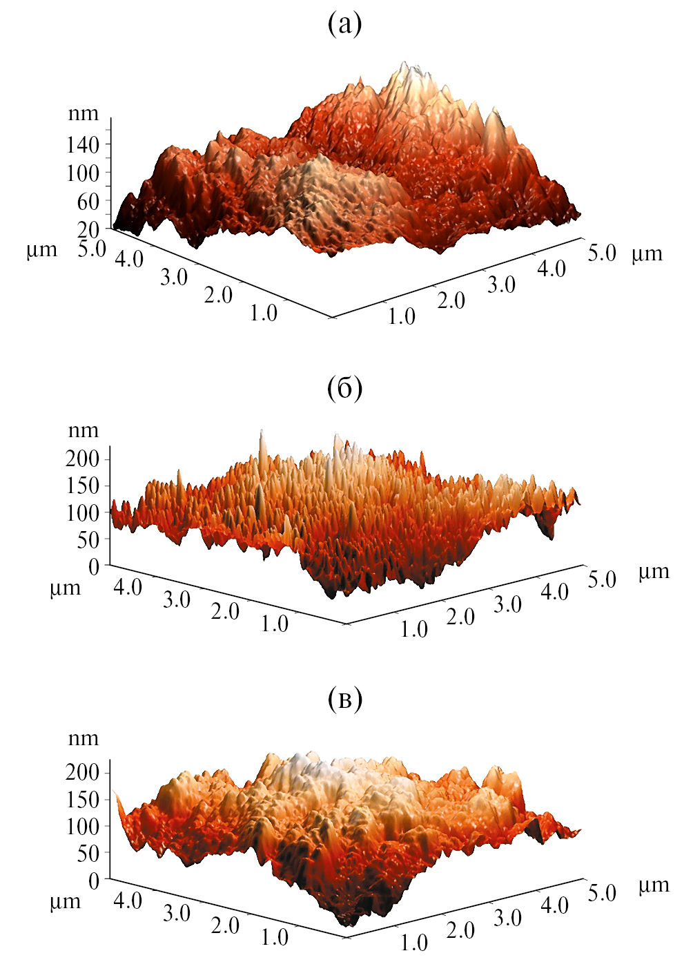 Плазмоокислительная деструкция полимера сопровождается изменением топологии его поверхности. Воздействие плазмы приводит к росту шероховатости образца (рис. 2). Средняя шероховатость у исходного образца составляет 18.7 нм; у образца, обработанного в плазме кислорода, – 23.9 нм; в плазме аргона – 23.3 нм.