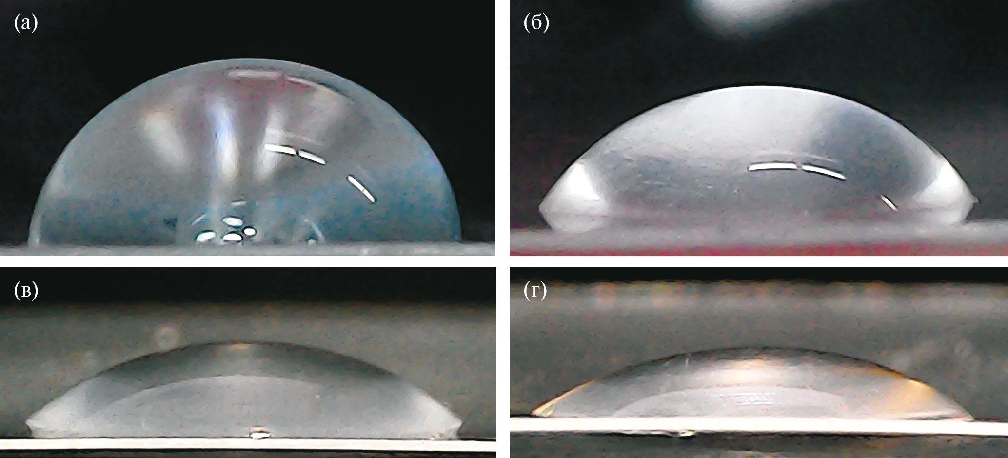 Рис. 3. Фото капель воды и раствора mDDA на поверхности пленки ПЭ: (а) капля воды на исходном образце; (б) капля воды на образце, обработанном в плазме кислорода при токе 50 мА; (в) капля раствора мономера на образце, обработанном в плазме кислорода при токе 50 мА; (г) капля воды на образце, обработанном в плазме кислорода, после прививки и активной отмывке мономера.