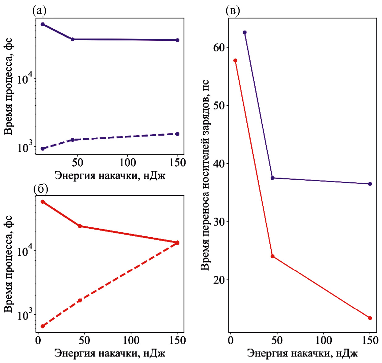 Наиболее простым кажется предположение о том, что “быстрый” процесс также связан с процессом переноса носителей заряда. Например, можно допустить, что “медленный” процесс связан с переносом дырок, а “быстрый” – электронов или наоборот. Однако это не соответствует отмеченной ранее зависимости времени процесса переноса от энергии накачки. Данное предположение не объясняет и второго факта – различия в зависимостях времен процессов от энергий накачки для двух образцов для “быстрого” процесса и отсутствие такого различия для “медленного” процесса.