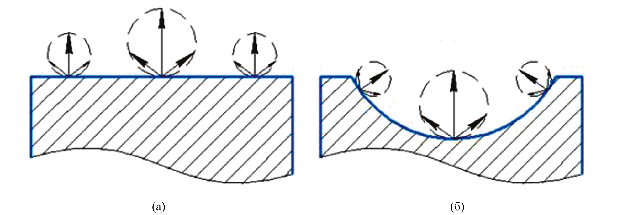 При испарении невысокой интенсивности обычно принимается n = 1 [22]. На рис. 1 показана качественная картина распределения векторов плотности потока продуктов абляции с поверхности мишени под воздействием лазерного излучения для режима n = 1. Каждая из окружностей, касающихся поверхностей, на этом рисунке представляет собой уравнение косинусоиды в полярной системе координат; концы векторов лежат на окружности. Меньшие значения модуля плотности потока продуктов абляции на периферии зоны облучения (рис. 1а) являются следствием двух причин: 1) меньшей интенсивности лазерного излучения в этих местах и 2) более интенсивным отводом тепла в объем мишени. В результате этого при развитии абляции формируется кратер вогнутой формы с осевой симметрией относительно нормали к поверхности в его центре (рис. 1б). К отмеченным двум факторам в режиме абляции из кратера (рис. 1б) добавляется третий – снижение интенсивности излучения в результате наклонного падения луча на облучаемую поверхность в зоне, удаленной от центра, с сопутствующим ростом площади испарения.