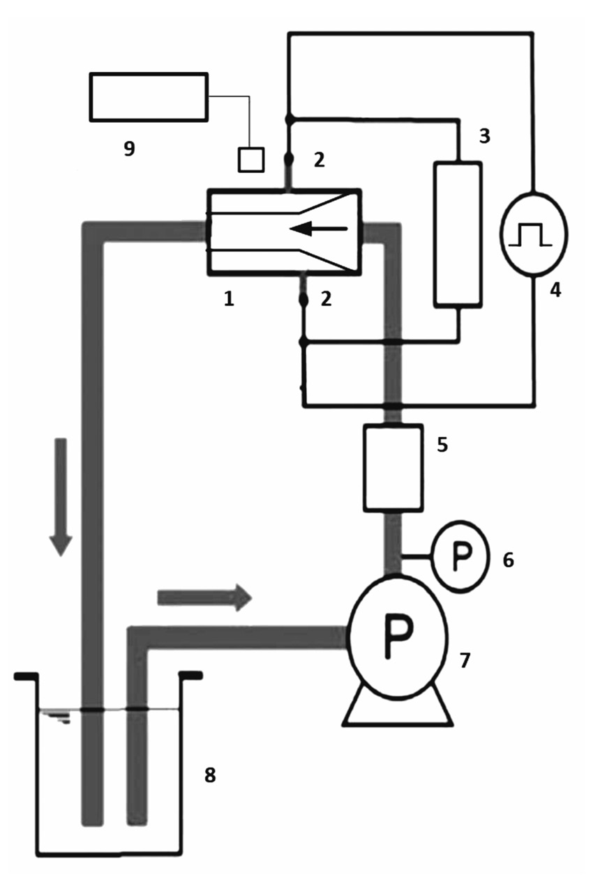 Рис. 1. Блок-схема эксперимента. 1 – Проточный кавитационный плазменный реактор, 2 – электроды, 3 – контроль напряжения, 4 – импульсный генератор, 5 – измеритель расхода, 6 – манометр, 7 – подающий насос, 8 – емкость с обрабатываемой водой, 9 – спектрометр.