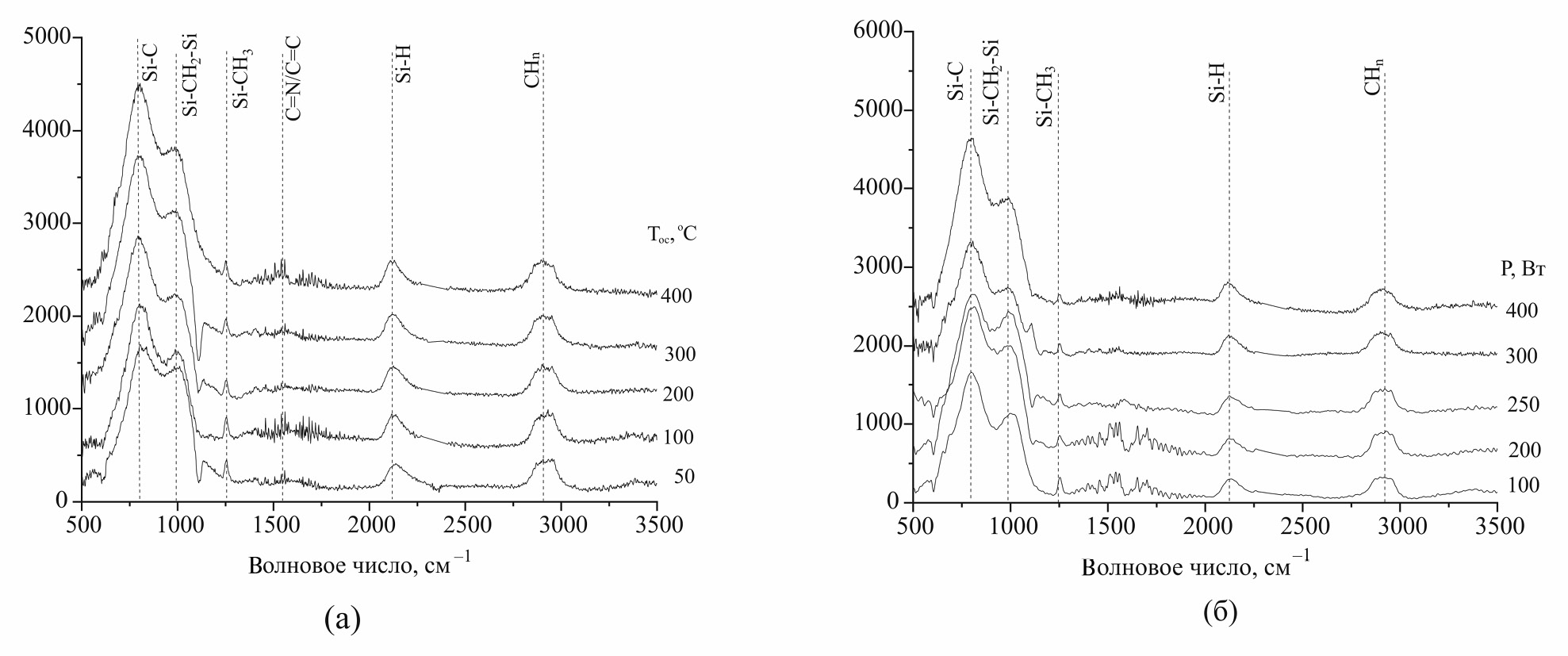 Рис. 5. Эволюция ИК-спектров пленок SiCx:H при изменении (а) температуры синтеза и (б) мощности плазмы.