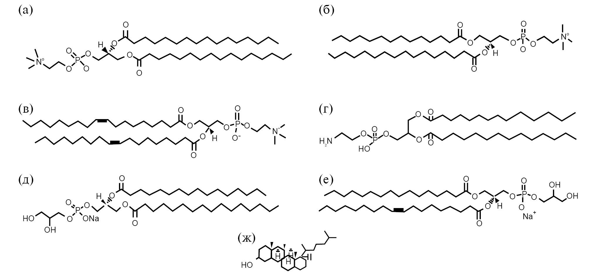 Рис. 1. Структурные формулы липидов ДПФХ (а), ПМФХ (б), ДОФХ (в), ДМЭА (г), ДПФГ (д), ПОФГ (е), холестерин (ж).
