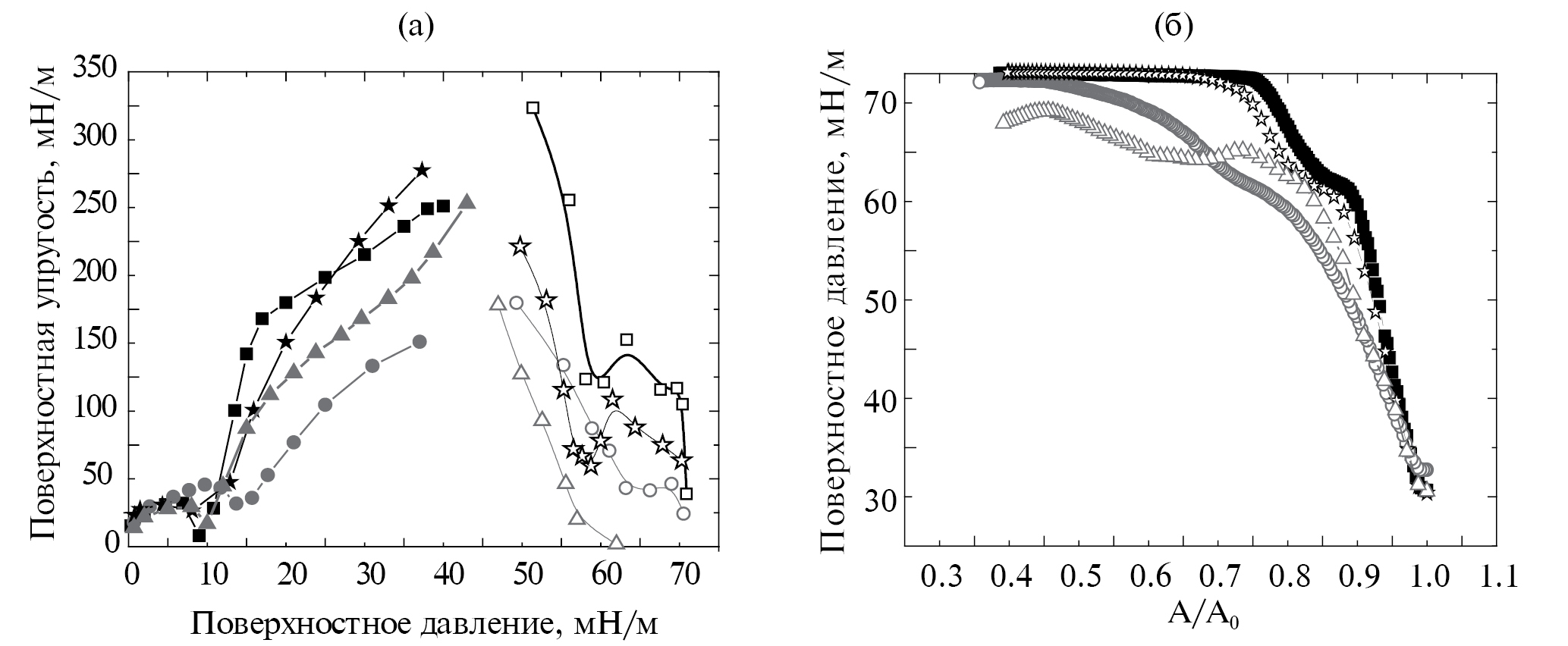 Рис. 6. (а) Зависимости динамической поверхностной упругости (закрашенные символы) и эффективной поверхностной упругости (пустые символы) от поверхностного давления и (б) изотермы сжатия для нанесенных монослоев ДПФХ (квадраты), ДПФХ/ДОФХ 9/1 (круги), ДПФХ/ПОФГ 9/1 (звезды) и ДПФХ/холестерин 9/1 (треугольники) при Т = 35°С.