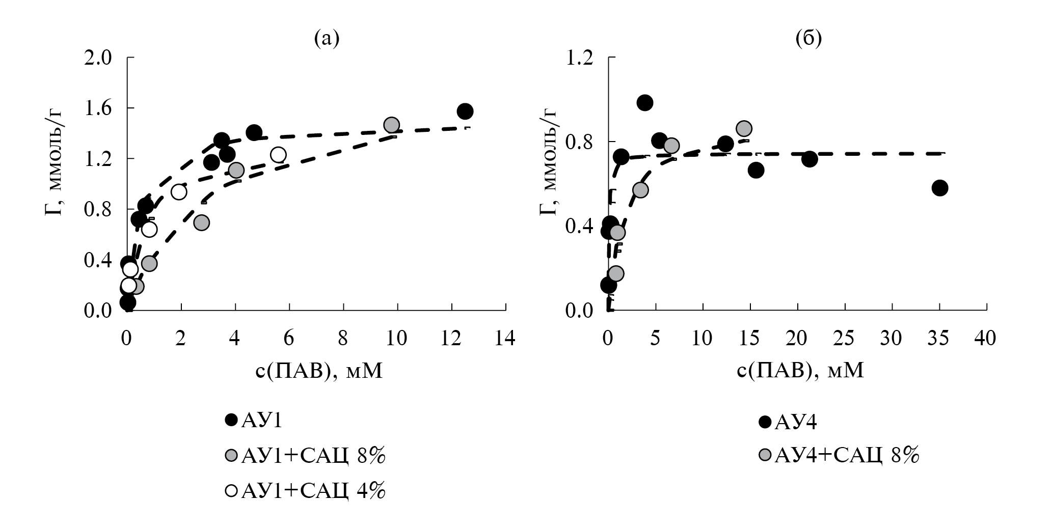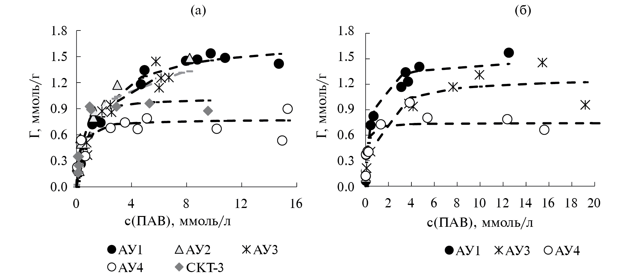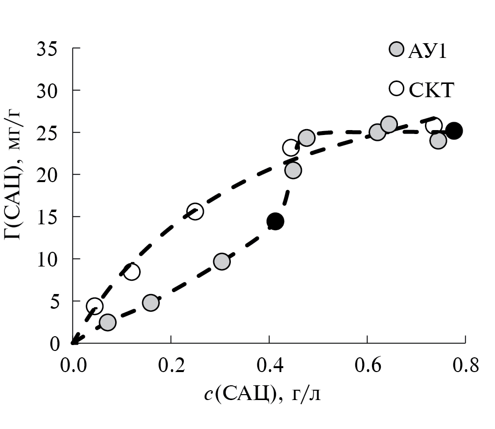Для установления того, насколько модифицирующий агент САЦ удерживается на поверхности активированного угля, в том числе в присутствии анионных ПАВ, была получена изотерма адсорбции САЦ на АУ и исследована его десорбция в присутствии ПАВ при концентрации, превышающей ККМ и соответствующей области насыщения на изотерме адсорбции. На рис. 3 приведены изотермы адсорбции САЦ на активированных углях (образцы АУ1 и СКТ, черным отмечены концентрации, при которых проводились исследования адсорбции анионных ПАВ).