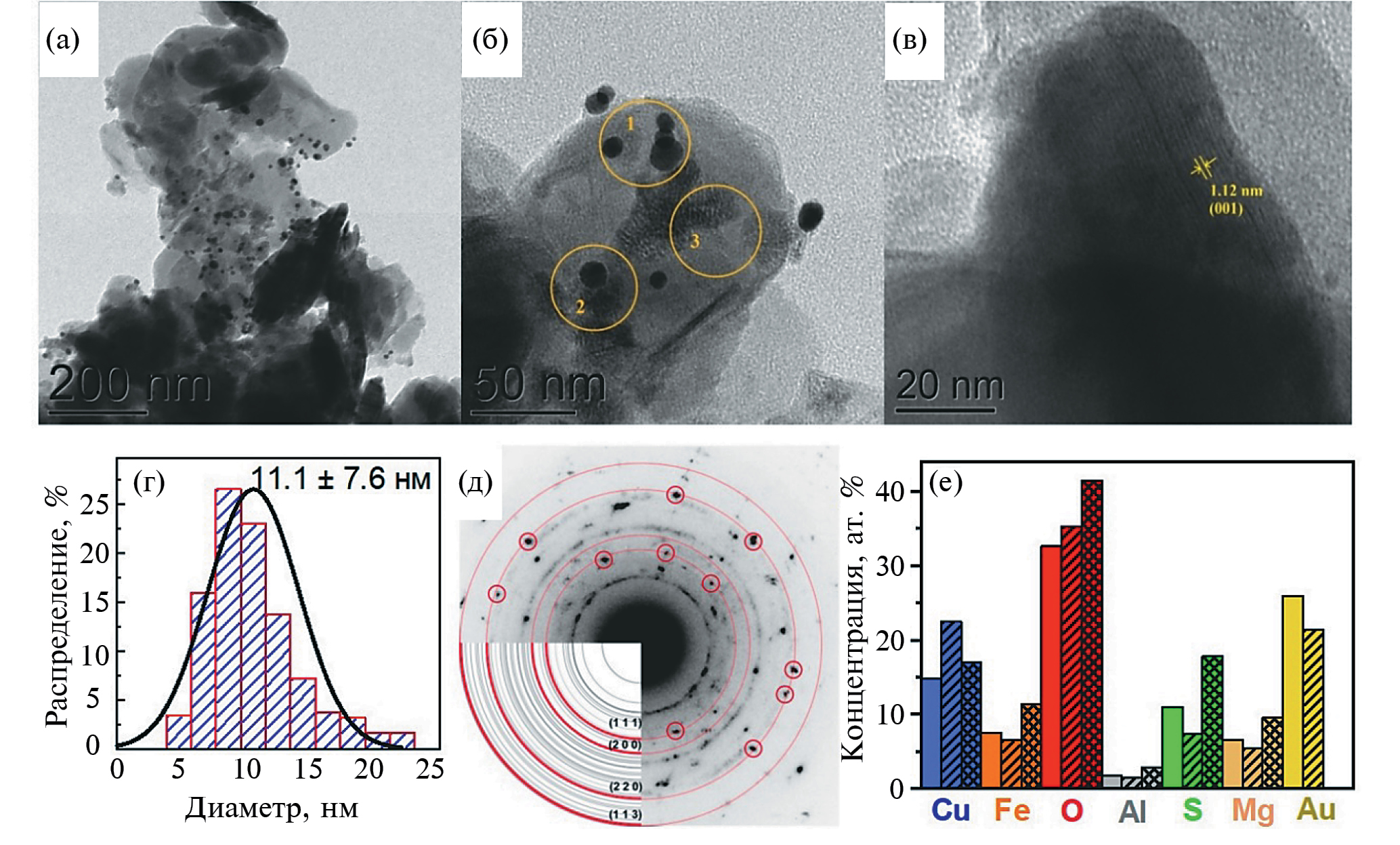 Рис. 5. Характерные ПЭМ микрофотографии (a-в); г – гистограмма распределения НЧЗ по размерам; д – картина микродифракции электронов для образца валлериита, допированного алюминием, после осаждения НЧЗ из коллоидного раствора; е – данные рентгеновского энергодисперсионного микроанализа снятого с 3 участков, обозначенных на рисунке (б): участок № 1 – незаштрихованные столбцы, участок № 2 – одинарная штриховка, участок № 3 – двойная штриховка.