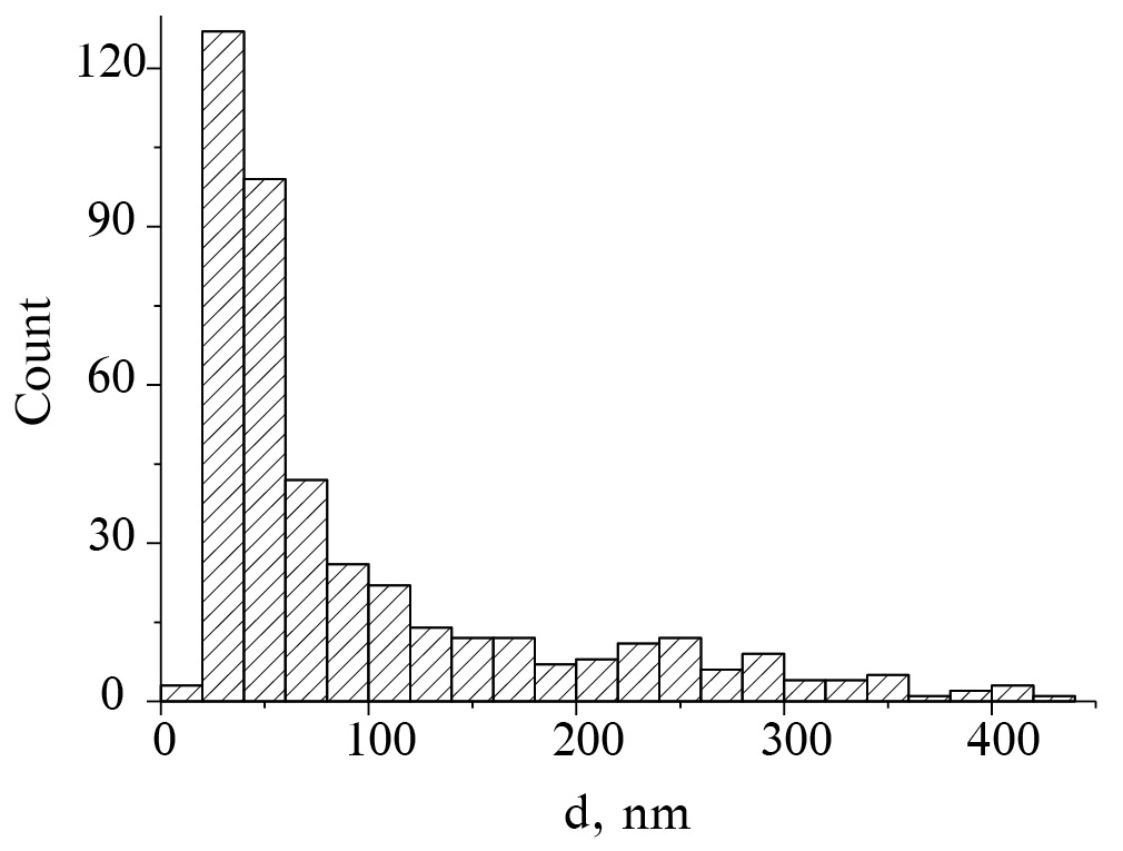 При получении образцов для исследования был использован коммерческий порошок, содержащий частицы наноалмаза статического синтеза, прошедший предварительную очистку. Для проведения исследований потребовалась его дополнительная очистка. Согласно литературным данным, частицы, образовавшиеся в процессе синтеза, после их очистки кислотами и механической очистки содержат внутреннюю кристаллическую структуру алмаза, покрытую оболочкой из углерода иных форм [32]. После дополнительной очистки, включающей отмывание в дистиллированной воде и многократные и чередующиеся ультразвуковую обработку и центрифугирование, была получена дисперсная фаза, не содержавшая крупных частиц и агрегатов из них. Гистограмма распределения частиц алмаза в дисперсной фазе по размерам d (d – средний размер на снимке), полученная по результатам обработки электронно-микроскопических снимков частиц, представлена на рис. 2.