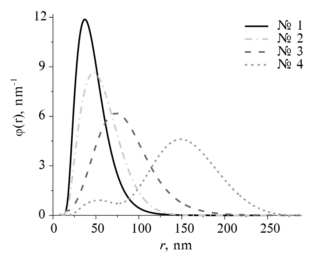Для всех выделенных фракций электрооптическим методом были определены функции распределения частиц по размерам j(r). Образцы № 1, № 2, № 3 и № 4 содержали частицы и агрегаты, отличающиеся по размерам. Функции j(r) этих образцов представлены на рис. 3.