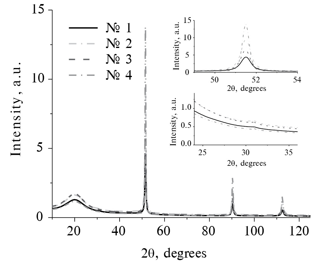 Как видно из рис. 4, в области углов дифракции 51.3˚, 90.3˚ и 112.3˚ для всех образцов наблюдаются пики, свойственные алмазу. В области угла 30.5˚ для всех образцов присутствует пик, характерный для графита 2H (30.5˚) и 3R (31.0˚). Широкой полосе с максимумом при 20˚соответствует аморфный углерод. Пики, характерные для графитоподобной структуры и аморфного углерода, указывают на то, что часть углерода в частицах всех образцов находится в состоянии отличном от алмазной кристаллической решетки. Количественная оценка содержания аморфного углерода в этом случае не представляется возможной. Однако можно утверждать, что для первого образца доля аморфного углерода в частицах больше, чем для остальных.